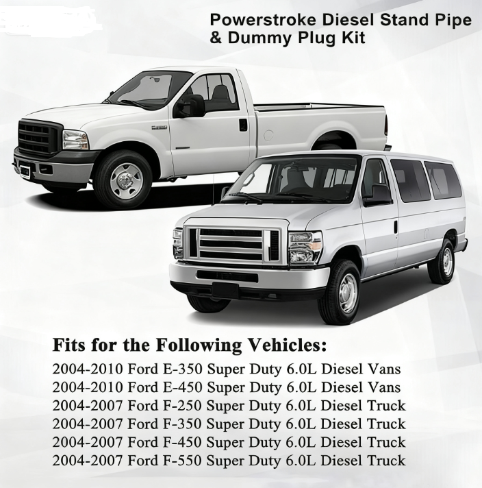 Updated Stand Pipe and Dummy Plug Kit for 2004-2010 Ford 6.0L E-350 F-250 Diesel 🔧 Updated Stand Pipe & Dummy Plug Kit – For 2003–2010 Ford 6.0L Diesel (F-250/F-350/E-350/Excursion) 🔧 【Integrated Check Valve | Durable Build | OE Replacement (6E7Z9A332A/3C3Z9K042A) | 90-Day Warranty】Prevents High-Pressure Oil System Issues 1. Core Features 🔹 Exact Fit for 2003–2010 Ford 6.0L Diesel Models Engineered exclusively for Ford’s 6.0L Power Stroke diesel engines in heavy-duty trucks and vans—covers critical workhorse models: Vehicle Model Production Years Key Fit Notes Ford F-Series F-250/F-350/F-450/F-550 Super Duty (2003–2007), F-650/F-750 (2004–2008) Fixes common high-pressure oil system (HPOS) failures; ensures reliable startup for heavy-duty use. Ford E-Series E-350 Club Wagon (2004–2005), E-350/E-450 Super Duty (2004–2010) Maintains oil pressure for vans used in towing or commercial applications. Ford Excursion 2003–2005 Replaces aging stand pipes/plugs to prevent stalling or no-start issues in SUVs. Critical Fit Check : Confirm your vehicle has a Ford 6.0L diesel engine (not 6.7L or gas engines) and falls within the listed production years – incompatible with other engine variants. 🔧 Improved Design & Durable Construction Integrated Check Valve : A key upgrade over OEM parts – keeps oil in the top of the engine, helping the HPOS reach working pressure faster when starting. This reduces cranking revolutions and prevents no-start/hard-start problems. Long-Lasting Materials : Made of rust-resistant, corrosion-resistant components – withstands diesel engine heat and oil exposure; undergoes testing to ensure reliability over extended service life. Preventative Maintenance : Addresses a known weak point in 6.0L diesels – replacing old stand pipes/plugs before they fail avoids costly breakdowns (e.g., HPOS pressure loss, stranded vehicles). 🌟 Complete 6-Piece Kit Includes all components needed for a full HPOS upgrade (no extra parts required): 2 × Stand Pipes (OE: 6E7Z9A332B) 2 × Dummy Plugs (OE: W302908) 1 × Fuel Rail Oil Tube Plug (OE: 3C3Z9K042A) 1 × Small O-Ring (OE: W302675) 2. Technical Specifications Parameter Category Detailed Specifications Condition 100% Brand New Product Type Updated Stand Pipe & Dummy Plug Kit (for 6.0L diesel HPOS) OE/Interchange Part Numbers Stand Pipes: 6E7Z9A332A/B, 904-195; Dummy Plugs: W302908, 904-231; Fuel Rail Plug: 3C3Z9K042A, W302675 Material Rust/corrosion-resistant durable materials Color Black Compatibility 2003–2010 Ford 6.0L diesel models (F-250/F-350/E-350/Excursion/F-650/F-750) Warranty 90-Day Manufacturer Warranty; 30-Day Free Return Shipping Origin CA or NJ warehouses (dispatched within 24 hours of cleared payment, excluding weekends/holidays) 3. Package Included 2 × 6E7Z-9A332-B Stand Pipes 2 × W302908 Dummy Plugs 1 × 3C3Z-9K042-A Fuel Rail Oil Tube Plug 1 × W302675 Small O-Ring 4. Usage & After-Sales Tips Installation Guidelines Prep : Ensure the engine is cool; relieve HPOS pressure (follow Ford 6.0L service procedures) to avoid oil spray during disassembly. Remove Old Parts : Locate and remove the original stand pipes, dummy plugs, and fuel rail plug from the engine’s HPOS. Install New Kit : Replace with the updated components, ensuring the O-ring is properly seated; torque parts to Ford OEM specs (typically 18–22 ft-lbs for stand pipes). Test : Re-pressurize the HPOS, start the engine, and check for oil leaks or abnormal cranking. Note : No instruction included – recommend searching online guides or consulting a diesel technician for installation. After-Sales Support Fitment Issues : If parts don’t align, confirm your vehicle has a 6.0L diesel engine – contact the seller for verification. Defects : If components are damaged, missing, or fail post-installation, reach out immediately for a replacement. Feedback First : Contact the seller before neutral/negative feedback – all issues (e.g., shipping, quality) will be resolved promptly. The essential HPOS upgrade for Ford 6.0L diesels! This kit prevents startup issues and costly failures – tailored for 2003–2010 F-250/E-350/Excursion models. 🚗⚙️