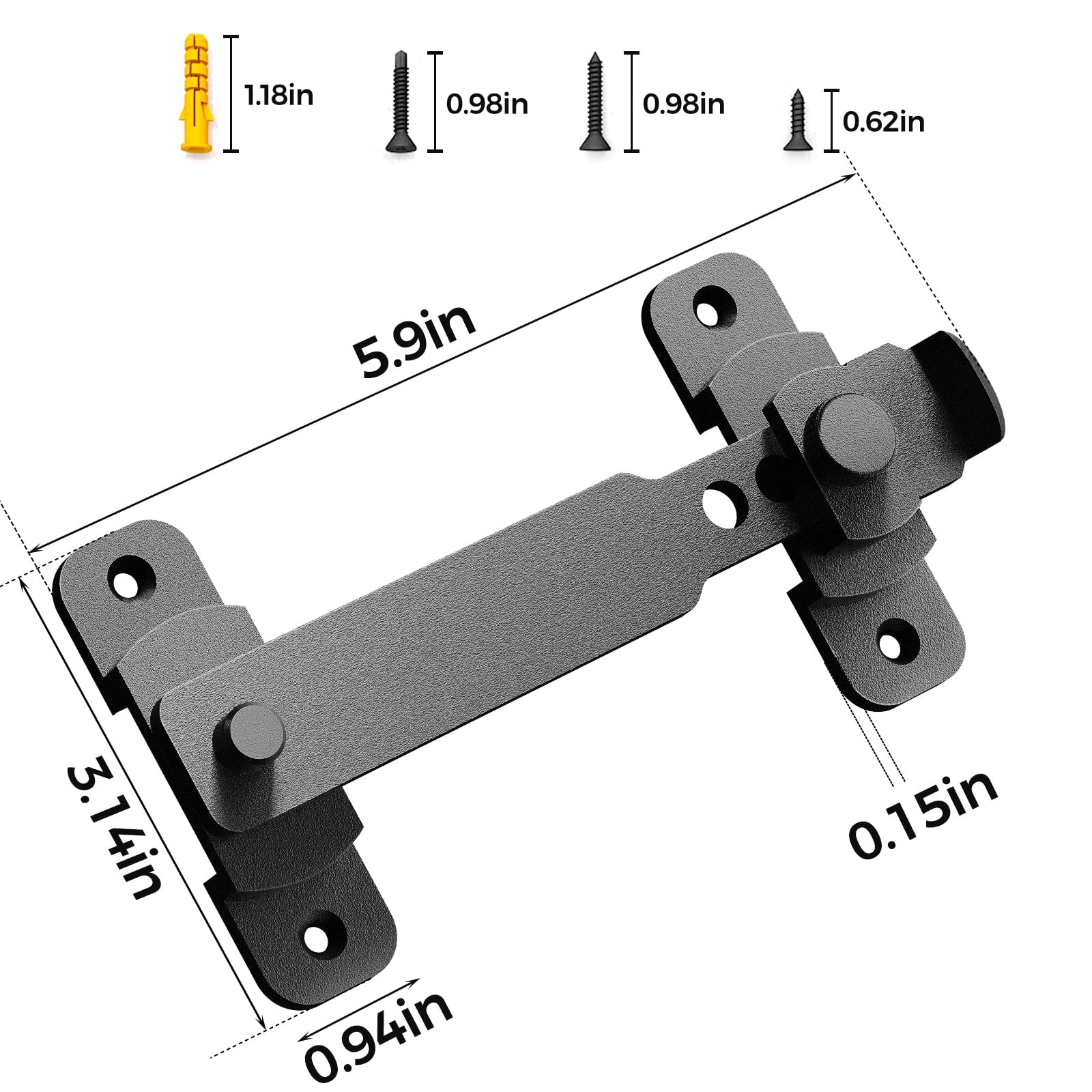 Upgrade Sliding Barn Door Lock Latch, Stainless Steel Gate Flip Latch Lock for Household, Shed, Sliding Doors, Garage, Outdoor Fence (5.9 inch, Black) Stainless Steel Material: The barn door latch made of SUS-304 solid stainless steel castings, sturdy, not easily bend or deform, ensuring quality and durability Upgraded Design: The gate latch’s movable rod offers three adjustable positions for flexible installation. It locks into one of the holes and can be securely fixed by rotating the knob, prevent strangers from prying Compact and Practical: simple and practical, suitable for various types of barn doors, garden doors, garage doors, windows, sliding doors, bathroom doors, cabinets, etc Easy Installation: Designed for simple installation on wood or flat surfaces, it allows for 360-degree rotation, giving you the flexibility to choose left or right-side installation. Just tighten the 4 screws with a screwdriver for a secure and stable setup What's in the box: 1 barn door lock, 12 screws