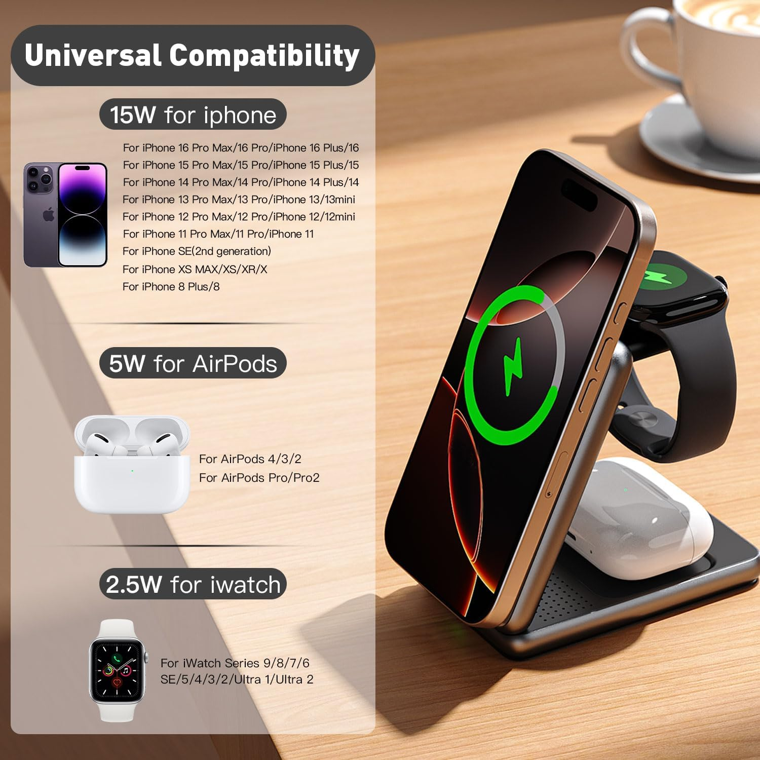 Store New Arrivals Add to Favorite View Feedback Contact Fast deliveries to the customer's home Quality customer service John Make the customers happy! Upgraded 3-In-1 Magnetic Wireless Charger, Foldable Charging Station, Electromagnetic Induction Base,Compatible with Magsafe,Compatible with Iphone 12-17 Series, Apple Watch, and Airpods Description 【Important Note】: Please remove any magnetic or metal accessories from your phone case before charging. 【Wide Compatibility】: The W93 3-in-1 Magnetic Wireless Charger is compatible with iPhone 16, 16 Pro, 16 Plus, 16 Pro Max, 15, 15 Pro, 15 Plus, 15 Pro Max, 14, 14 Pro, 14 Plus, 14 Pro Max, iPhone 13, 13 Pro, 13 Pro Max, 13 Mini, 12, 12 Pro, 12 Pro Max, 12 Mini, as well as AirPods 3, AirPods Pro 2, and AirPods Pro (only compatible with MagSafe-enabled Apple devices or MagSafe-compatible cases). 【Speed and Convenience Combined】: Say goodbye to slow charging! With 25W power output, this 3-in-1 magnetic charger simultaneously charges your phone, watch, and earphones, boosting work efficiency. Utilizing precise magnetic positioning, it provides high-speed wireless charging, reducing energy loss and keeping your devices ready at all times. Perfectly suited to the performance-driven and efficiency-focused lifestyle of modern multitaskers, you can watch movies, listen to music, make calls, send messages, or play games without missing a single exciting moment while charging. 【Compact and Portable, Foldable, Travel Essential】: This 3-in-1 charger combines powerful functionality with portability. Its stylish foldable design saves space and makes it easy to carry. Whether you're at work, traveling, or simply want to keep your desk tidy and create more workspace, your phone can rotate 360 degrees while charging, switching between portrait and landscape modes. Wherever you are, fast wireless charging is always with you. 【Intelligent Protection, Safe Electricity Use】: The charger is made of environmentally friendly fire-retardant PC and aluminum alloy materials, with a metallic paint coating that enhances its tactile feel and shine. Its stylish appearance is complemented by intelligent safety temperature control technology. Numerous ventilation holes on the back and bottom provide multi-layer protection against overvoltage, overcurrent, and overcharge, ensuring your charging safety. 【Suitable for Various Occasions】: Whether you're working at your desk, relaxing in bed, or traveling light, this portable wireless charger adapts to your lifestyle. Whether at home, in the office, or on the go, it keeps your devices fully charged anytime, anywhere. 【After-Sales Service】You will receive: A multi-functional iPhone wireless charging stand, a USB to Type-C charging cable, and a user manual. If you have any questions, please contact us; we are happy to provide you with a satisfactory solution. Product description Item model number W93 Package Dimensions 5.28 x 4.25 x 1.46 inches Number of Items 1 Color Silver drawing Wattage 22.5 watts Connector Type USB Type C Compatible Devices Headphones, watch Item Weight 8.4 ounces Input Voltage 12 Volts Compatible Phone Models function(f) {var _np=(window.P._namespace("DetailPageProductOverviewTemplatesJava"));if(_np.guardFatal){_np.guardFatal(f)(_np);}else{f(_np);}}(function(P) { P.when('A').execute(function(A){ A.on('a:truncate:po-attribute-truncate-3:updated', function(data) { var isTruncated = !data.truncateInstance.getIfTextFits(); var seeMoreElement = document.getElementById('po-attribute-see-more-id-3'); if(seeMoreElement) { seeMoreElement.style.display = isTruncated ? '' : 'none'; } }) }); })); with iPhone 16, 16 Pro, 16 Plus, 16 Pro Max, 15, 15 Pro, 15 Plus, 15 Pro Max, 14, 14 Pro, 14 Plus, 14 Pro Max, iPhone 13, 13 Pro, 13 Pro Max, 13 Mini, 12, 12 Pro, 12 Pro Max, 12 Mini See more Special Feature Fast Charging, Magnetic, Magsafe Compatible, Travel Included Components 1 X 3 in 1 Charging Station ABOUT US We offer the best prices around on high quality products. Our E-store includes media such as books, movies, music and games while offering electronics, toys, sporting apparel, clothing, tools, general home, garden items and more. SHIPPING We are always working hard to ensure your package arrives as soon as possible. Please understand that some factors like weather, high postal traffic, and the performance of shipping companies are outside of our control. We offer free shipping to the lower 48 states and ship within 2 business days of payment, usually sooner. We do not accept P.O. Boxes. Please provide a physical address. For shipping outside of the continental USA, we only use eBay's Global Shipping Program. The item is shipped to KY and then sent to the rest of the world. International customers are responsible for all duties and taxes. Continue to 'check out' to calculate costs for shipping the item to your country. Messages regarding eBay's Global Shipping Program MUST be directed at eBay EXCLUSIVELY. RETURNS We offer a 30-Day Return Policy on items in which you are not completely satisfied with. You have the option of a full-refund or an exchange of the item. No returns are available on items shipped outside of the USA PAYMENT We accept PayPal. CONTACT US This page content is yet to come Please ad us to your favorite seller and visit again later Thank You CUSTOMER SATISFACTION We try our very best to make sure every customer is completely satisfied. If there's a problem, message us! We're happy to help. WE ACCEPT