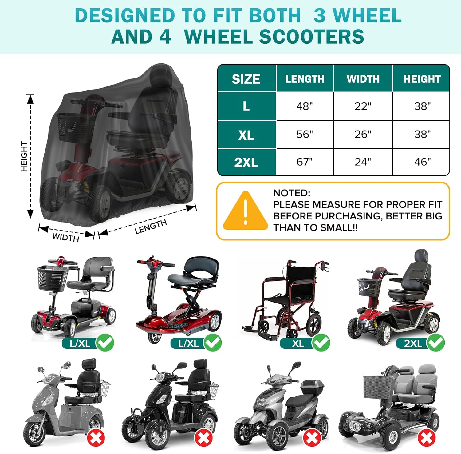 Heavy Duty - Made of the Thick 420D Oxford Fabric(with Waterproof Strip) which is water resistant as well as breathable, able to resist 1000 MM rain water pressure, meaning a downpour will not be a match to the cover Anti-UV, Nano Coating - Our electric scooter cover was designed to fit both four wheel and three wheel scooters, wheelchair, Anti-UV, inner layer add nano Material coating, so the inner layer is extra smooth, soft and won't scratch your scooter, used for gogo pride scooter, outdoor or indoor Double-needle Sewing Process - Adults mobility scooter cover is water resistant with Double-needle sewing process, adding waterproof strips to ensure that no water drops penetrate the cover to the components. All-round protection for your electric mobility scooter 2 Buckles &Free Storage Bag - Adds a custom look and a tighter fit Size: 48"L x 22"W x 38"H, elastic hem sew in the bottom of cover for a secure fit, 2 Buckles for the cover can be tightly fixed on your scooter Carrier when your transport it too. A free storage bag for your cover, easily put into the storage bag without being folded neatly. Noted, when you transport it, remember to tie it well on the trailer or rack. If not, it is easy to get break or off because of strong wind on the highway. Services - Not satisfied? Any time, Anywhere and Any reason, sending us a message. We will help you resolve your concern or provide a refund. Product Description Fitment: Most4 wheel or 3 wheel scooters Not fitment: Pride Victory 10 LX/UP size seat & mirrors, ewheels EW-46