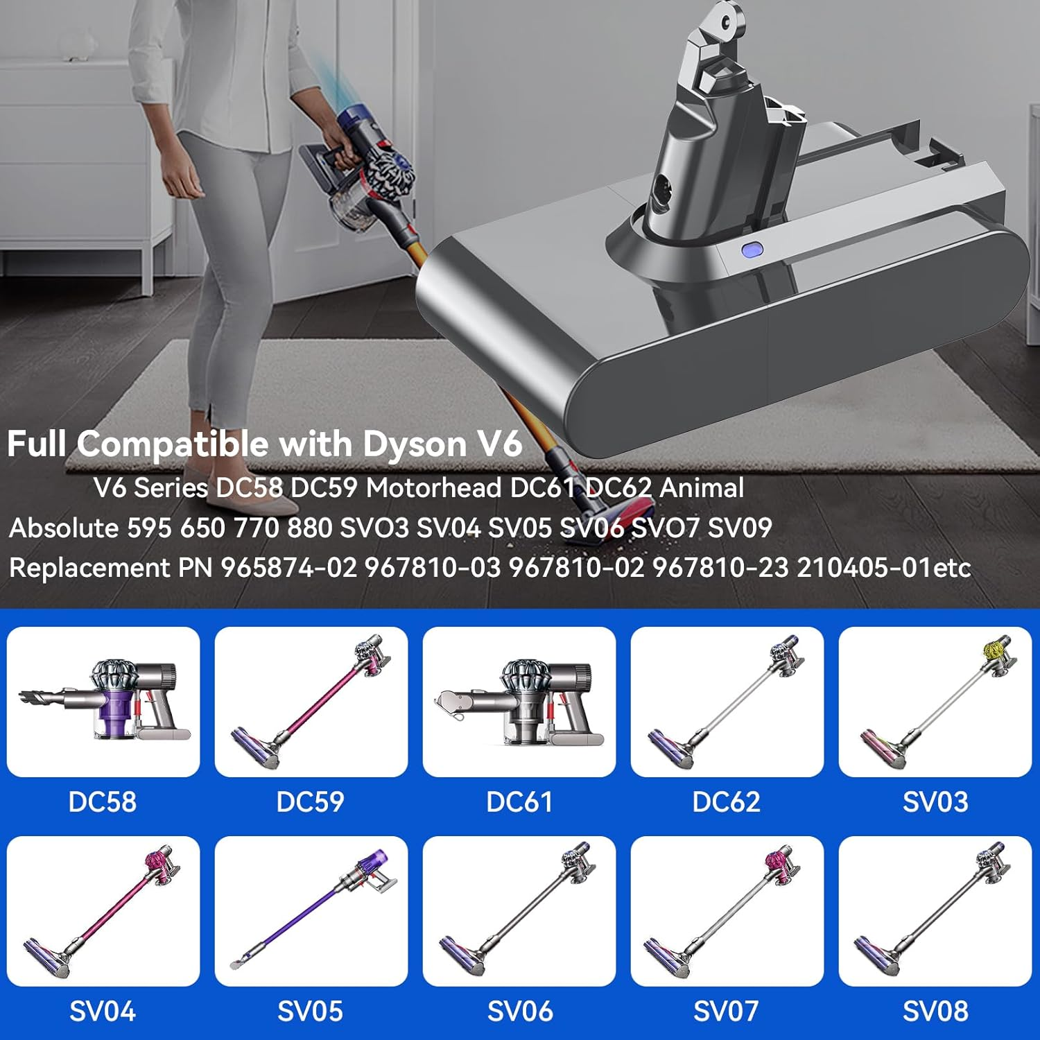 Store New Arrivals Add to Favorite View Feedback Upgraded 6000Mah V6 SV04 Vtc4 Battery 967810 Replacement Battery for Dyson V6 Animal Absolute Motorhead Slim SV03 SV04 SV05 SV06 SV07 SV09 Vtc4 DC58 DC59 DC61 DC62 DC72 DC74 V6 Handheld Stick Vacuum Description Item model number Dyson V6 Batería Battery Cell Composition Lithium Ion Brand POWTREE Country of Origin China Item Weight 15.2 ounces Batteries 1 Lithium Ion batteries required. Recommended Uses For Product For Dyson V6 Battery Replacement Number of Batteries 1 Lithium Ion batteries required. Manufacturer POWTREE Package Dimensions 6.73 x 3.98 x 3.31 inches Compatible Phone Models Dyson V6 Battery 🌳【Battery Type】Battery type: Lithium-ion Voltage: 21.6V, Capacity: 6000mAh. No memory effect, no pollution, and low self-discharge, can be charged or discharged as needed without loss of capacity. 100% compatible with original charger. 🌳【Compatibility】The Dyson battery is comfirmed to equal to original Dyson V6 SV04 Vtc4 Battery. Perfectly compatible for 965874-02 967810-03 967810-02 967810-23 210405-01 210692-01 210691-01 209560-01 209476-01 209472-01 209432-01 204720-01. It also fits the original docking station and charger. 🌳【Upgraded Capacity】Upgraded 6000mAh replacement battery, higher capacity than original 2100mAh batteries, Support Max Mode suction power. Providing more power for your Dyson V6 vacuum. 🌳【High Quality】Battery uses the highest quality cells, safe with rapid-charge technology while providing overload protection, over current protection, short circuit protection, high temperature protection, to make sure you can use the vacuum cleaner safely. 🌳【Buy Worry-free】We provide 30 days money back, 12 month free replacement, Please contact us via Amazon message for warranty information. We will try our best to promise you an enjoyable shopping experience. Welcome to share your feelings with us. Dyson v6 Battery Vtc4 hhd10395 dyson max battery 214141 Replace Part Number: 965874-02 967810-03 967810-02 967810-23 210405-01 210692-01 210691-01 209560-01 209476-01 209472-01 209432-01 204720-01 Fit for V6 Series Model: (Pls use "Ctrl+F" to find your model) V6 Absolute,V6 Animal , V6 Motorhead, V6 Slim. DC58 DC59 DC61 DC62 DC72 DC74. SV03 SV04 SV05 SV06 SV07 SV09, 595 650 770 880 vacuum V6 Car+ Boat,V6 Top Dog,V6 Mattress,V6 Trigger, V6 Trigger Pro Excl, V6 Multifloor Exclusive, V6 Top Dog HEPA, V6 Trigger Extra, V6 Baby+ Child Vacuum ABOUT US We offer the best prices around on high quality products. Our E-store includes media such as books, movies, music and games while offering electronics, toys, sporting apparel, clothing, tools, general home, garden items and more. SHIPPING We are always working hard to ensure your package arrives as soon as possible. Please understand that some factors like weather, high postal traffic, and the performance of shipping companies are outside of our control. We offer free shipping to the lower 48 states and ship within 2 business days of payment, usually sooner. We do not accept P.O. Boxes. Please provide a physical address. RETURNS We offer a 30-Day Return Policy on items which you are not completely satisfied with. You have the option for a full-refund or an exchange of the item. No returns are available on items shipped outside of the USA. PAYMENT We accept PayPal. CONTACT US This page content is yet to come Please ad us to your favorite seller and visit again later Thank You