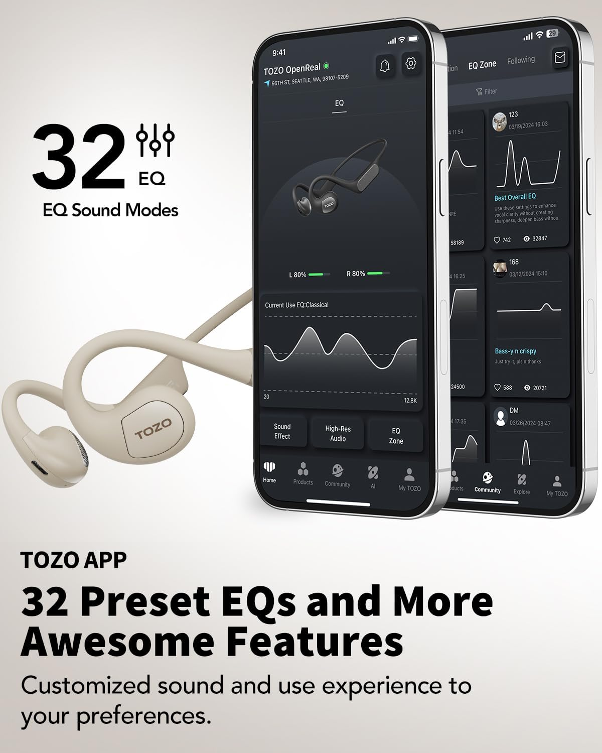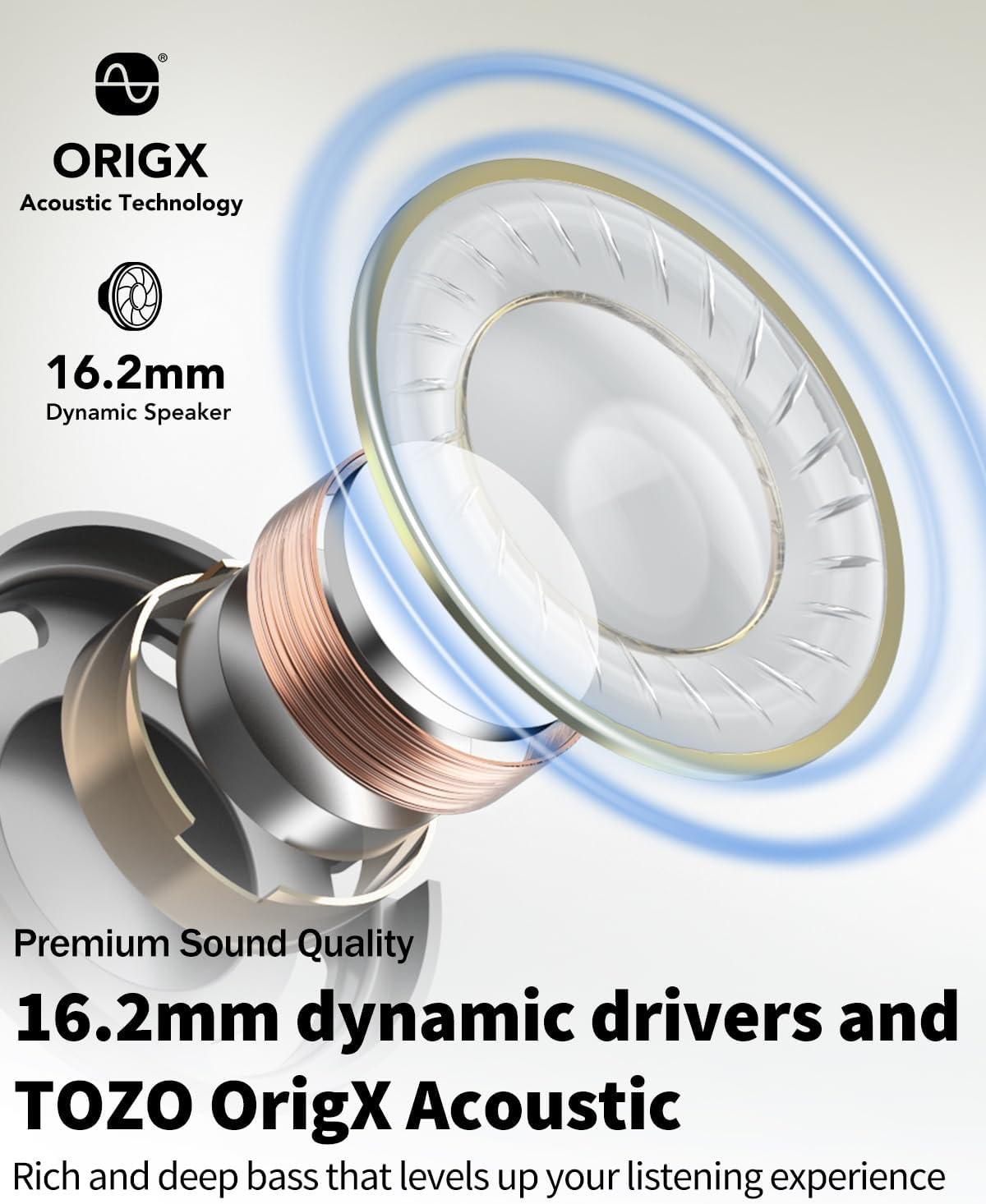 [Open-Ear Design] TOZO OpenReal headphones feature a completely innovative open-ear design for all-day listening without ear fatigue, the headphones can securely rest and firmly fit your ears without entering your ear canal, which will reduce stress after extended wear. [Air Conduction Technology & Ergonomic Design] Adopting the principle of air conduction, which can effectively prevent sound leakage, and transmit music ultra concentrated and clearly, allowing you to easily enjoy the superior music like a record. Extraordinary ergonomic design satisfies different auricle wear and delivers comfortable and stable experience (Not Bone Conduction). [Clear Calls with Dual-Mic ENC & Bluetooth 5.3] TOZO OpenReal headphones combine with dual microphones and noise reduction algorithm technology, which can restore the original sound, precisely capture your voice, cancel out ambient noise and deliver superior Clear Call. Therefore, you can achieve high-quality calls in any occasions. As well as equipped with true wireless Bluetooth 5.3 technology, so the connection is especially stable and brings the lower latency during data transmission. [16.2mm Dynamic Drivers] Through precise adjustment and professional testing, TOZO Acoustic Lab's customizes powerful 16.2mm dynamic drivers system for headphones, bringing you more beautiful and transparent sound effects. Deeply restore various rich details of the sound, creating an intimate concert-like audio experience. [Up to 16 Hours Playtime & Fast Charging] Built-in 120mAh large capacity battery, TOZO OpenReal headphones provide up to 16 hours of continuous playback and calls with one charge. Meanwhile, it supports fast charging with Type-C USB cable, just 10 minutes of charging can get up to 2 hours of playtime. Help you reduce the trouble of repeated charging and enjoy the whole day of listening. Product Description Open-Ear Design Hear the World in Maximum Comfort TOZO OpenReal provides you with all-day comfort and the ability to listen to your own soundtrack while enjoying the joy of various sports. Every moment is precious, and TOZO OpenReal grants you the freedom to experience each one. The Advantages of TOZO OpenReal (Air Conduction Headphones) 16-Hour Battery Life & Quick Charge TOZO OpenReal features a 1.5 hours quick charge for up to 16 hours of battery life. Adopt it to achieve your training goals, such as half-marathon runs, long-distance riding, one yoga class, etc. More Awareness of Surroundings By keeping the ear canal open allows you to enjoy your favorite music while staying aware of your surroundings, enhancing safety and situational awareness, making them perfect for outdoor activities. Clear Calls with Dual-mic ENC TOZO OpenReal intelligently analyzes and filters out unwanted noise from your surroundings even if you're in a busy street, ensuring that your voice remains clear and intelligible during calls. Directional Sound Technology Protects Your Privacy Directional sound technology ensures that the audio is directed toward your ears, minimizing sound leakage and enhancing the listening experience, creating a more immersive and focused soundstage. Let Your Ears Take a Fresh Breath The open-ear design makes air circulate freely, reducing moisture buildup and discomfort, and ensuring better ventilation and ear hygiene. Max Comfort for All-day Long Wearing Whether you are running or jumping, you can wear OpenReal for hours without any discomfort. TOZO OpenReal is carefully crafted to minimize ear pressure, which is perfect for extended periods of use. 16.2mm Huge Drivers Tuned by TOZO OrigX Immerse yourself in a captivating and high-quality audio experience beyond the confines of your ears. TOZO OrigX ensures that every beat and rhythm is amplified, providing dynamic and impactful bass. Bluetooth 5.3 Technology With the latest Bluetooth 5.3 technology, TOZO OpenReal offers improved stability, faster pairing, and lower power consumption. You can easily high-quality audio without any interruptions. 2 Hours of Playtime on a 10-Min Fast Charge With a 10-min fast charge, you can run a half marathon, watch a new movie or listen to 30 songs, providing a refreshing experience. Designed for Everyday Use Crafted with versatility as the core principle, OpenReal is thoughtfully designed to seamlessly adapt to your everyday needs. Whether you're commuting, working out, or simply relaxing, it effortlessly enhances your audio experience. More Awesome Features in TOZO App Customized Use Experience to Your Needs With the TOZO app, you have the ability to personalize and customize the touch controls according to your preferences and needs, and update the firmware of your device, ensuring that you have the latest enhancements and improvements. Embark on a hassle-free musical journey With a unique control button, you can effortlessly adjust the volume, switch songs and more. Its ergonomic design ensures a comfortable and hassle-free wearing experience. Let TOZO OpenReal become your ultimate companion, offering the perfect combination of convenience and comfort in your life.