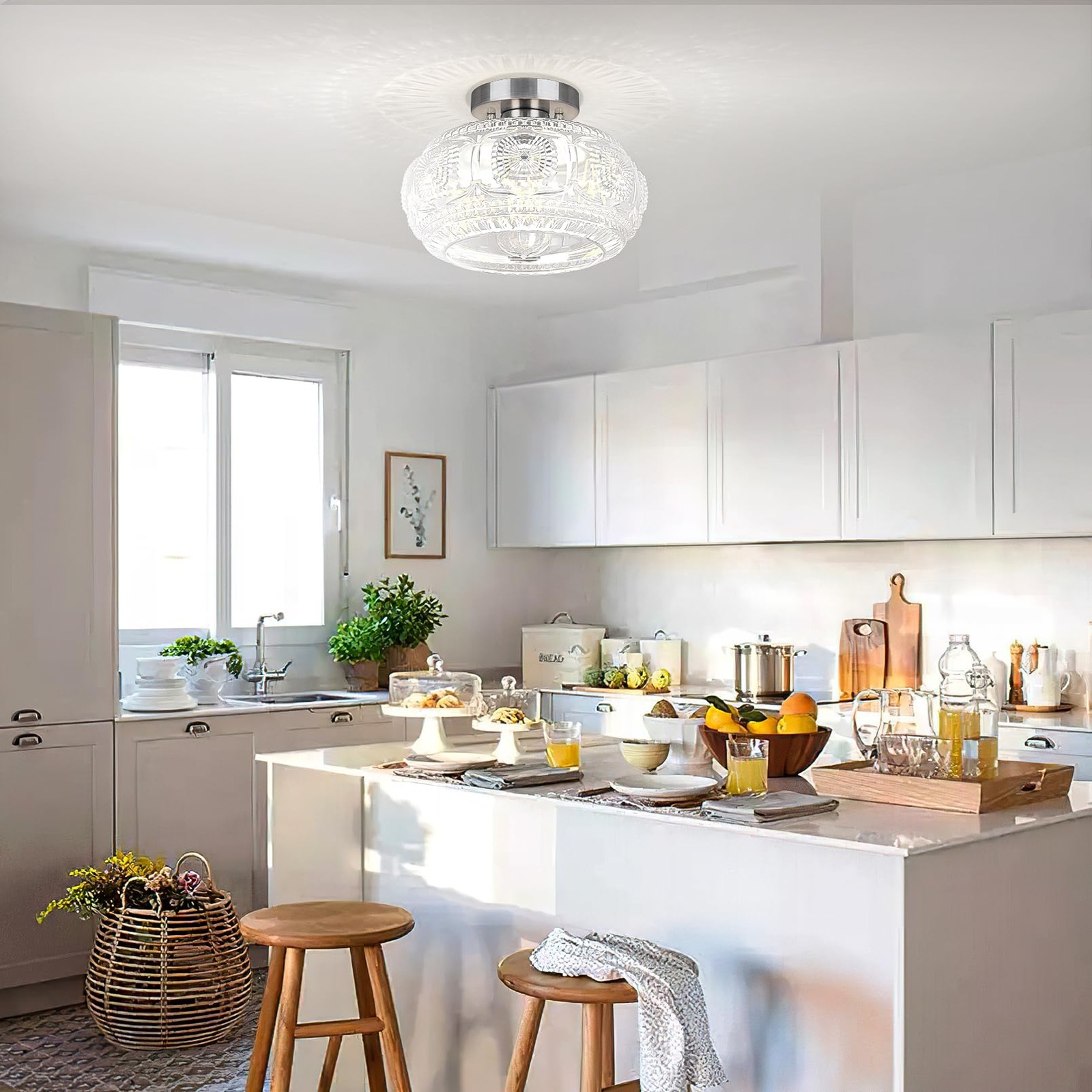 Semi Flush Mount Ceiling Light, Upgraded Larger Brushed Nickel Glass Ceiling Light Fixture, Vintage Lighting for Hallway Kitchen Bedroom Dining Room, Bulb Not Included Newly Upgraded Large Size: 11.03" L x 11.03" W x 8.04" H. This ceiling light is of larger size, it can be used as a decoration light for wider areas, such as kitchen, bedroom, dining room, powder room, bathroom etc Unique Design: Tired of the common ceiling light? this is the one you need to own! This semi flush mount ceiling light fixture can cast a beautiful shadow on the ceiling when it's on Premium Material: This ceiling light is well-made with quality glass shade and a metal base for a long time use, which can be used not only as a vintage style lighting, but also a modern life decoration E26 Base Bulb Required: This semi flush light fixture is Compatible bulbs with E26 sockets( not included, max 60w), such as incandescent, LED, CFL and halogen bulbs. You can choose the bulbs to create whatever atmosphere you want to have Quick Installation: Package includes all mounting hardware and an install instruction, you will easily and quickly assemble all the parts together