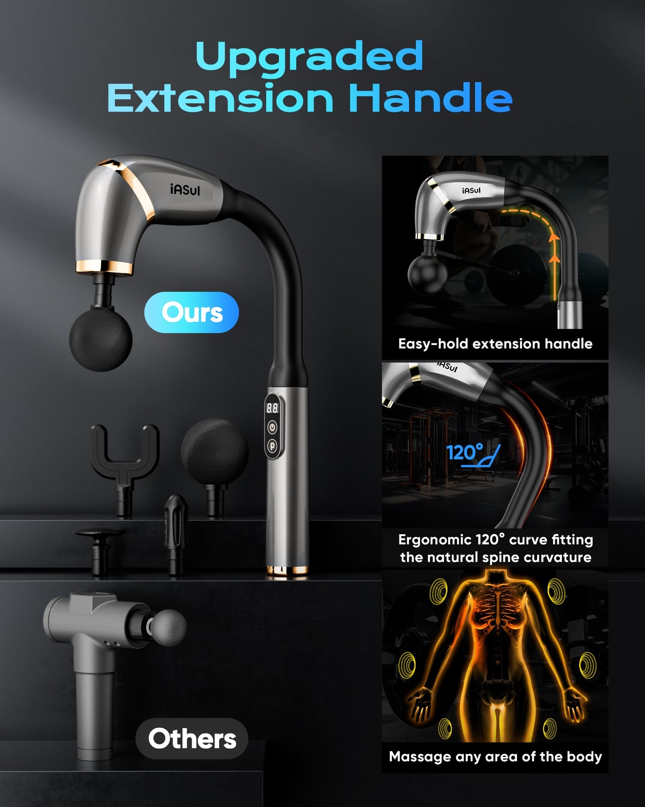 【Upgraded Extended Handle & Quick Pain Relieve】Our massage deep tissue is designed with an easy-to-grip extended handle and an ergonomic 120° curve that perfectly aligns with the natural curvature of your spine. Unlike regular massage , our massage deep tissue allows you to effortlessly reach and relax your back, neck, shoulders, arms, legs, and other hard-to-reach areas. Suitable for pain and speeding up recovery from sports injuries, it is a must-have for anyone seeking effective muscle relaxation and rejuvenation 【Smart LCD Screen & 4 Massage Heads】Our massage features an intuitive LCD screen that shows mode, speed level, and battery life. It comes with 4 massage heads to meet your various needs. When the massage is powered off, press the On/Off Switch once to check the battery level. Press and hold the On/Off Switch for 2 seconds to turn on the massage 【3 Modes & 6 Levels】Customize the massage with 3 modes and 6 speed levels. P1 Mode features 6 adjustable speed levels (1000-3000 RPM). P2 Mode (3200 RPM) and P3 Mode (3500 RPM) have a fixed speed setting. In P1 Mode, press the on/off Switch to adjust the speed from level 1 to 6. You can switch between modes by pressing the P key 【Long Battery Life】Recharge quickly in just 90 minutes with a USB-C cable. Enjoy a 15-minute massage session daily, and our massage will keep you relaxed for up to 15 days on a single charge. When the battery level shows 99, it indicates a full charge. Do not use the massage while it is charging 【Lightweight Holiday Gift Idea】Our massage is ergonomically designed for ease of use and portability. It's lightweight and comes with a user manual, this massage offers the best massage experience at home, in the gym, or at the office. This makes it the perfect present for Mother's Day, Father's Day, or any special occasion for your family, loved ones, and friends