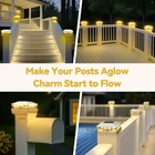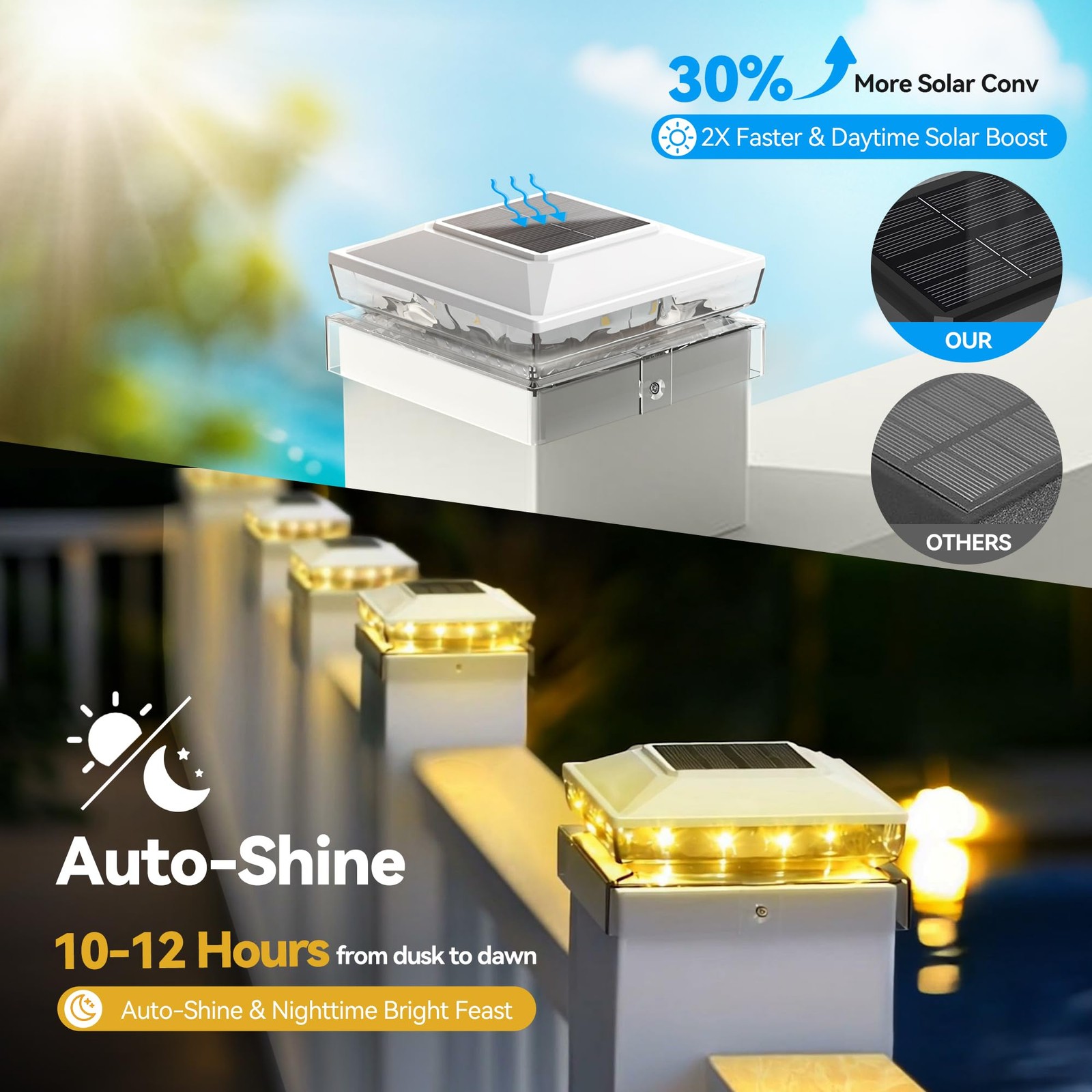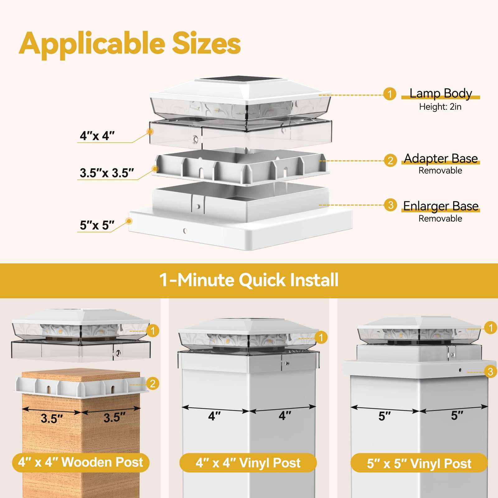 Solar Post Cap Lights & Illuminate Your Outdoor Spaces Tired of dark patios and gloomy decks? 12-Pack Upgraded Solar Post Cap Lights solve your lighting needs effortlessly. Fits 3.5" x 3.5", 4" x 4" or 5" x 5" Posts: Each one comes with 2 additional removable adapter base sizes for an ideal fit. Install in 1 minute flat with screws provided. 10-12 Hours of Steady Lighting: 30% more-efficient solar panels charge fully in 6-8 hours of sunlight. Enjoy 10-12 hours of warm white light, perfect for creating a relaxing porch evening in the soft glow. Upgraded One-piece Design & FCC-certified: Say goodbye to old-fashioned solar post lights that are assembled from several parts and are prone to gaps and leaks. Our one-piece design seals out water and resists wind. Rain or gale, these lights keep shining. FCC-certified for safety and quality. IP65 Waterproof & Reliably Performs: While IP44 lights may struggle in rain, our IP65-rated lights stand firm. Windy, rainy nights? Your garden, patio, and fence stay bright and beautiful. Warm Glow & Perfect Ambiance: The 3000K warm white light mimics a sunset-inspired glow, bathing your outdoor space. Be it posts, fences, or mailboxes, it creates a cozy, inviting feel. Compact and stylish, it's both a light source and a decor enhancer. Choose Solar Post Cap Lights. Bid farewell to darkness and welcome a well-lit, inviting outdoor space. Applicable Sizes: Our solar post cap lights fit 3.5"x3.5", 4"x4" and 5"x5" wooden or vinyl deck and fence posts. Each one comes with 2 additional removable adapter base sizes for an ideal fit. Install in 1 minute flat with screws provided. 10-12 Hours of Steady Glow: 30% more-efficient solar panels work wonders. Just 6 to 8 hours of sun charge the battery, powering 10-12 hours of steady light from dusk to dawn. Reliable IP65 Waterproof: When bad weather hits, our IP65 outdoor post lights stand strong, lighting up your fence even in wind and rain, while other IP44 lights may falter. Upgraded One-Piece Design: FCC-certified. Unlike old-fashioned part-assembled models, our fence post solar lights are fully integrated from top to base, eliminating gaps, preventing water seepage, and boosting wind & water resistance. 3000K Warm White Glow: Emits sunset-inspired light that softly bathes your posts, fence, deck, patio, garden, porch, and mailbox. Compact and stylish, it enhances both visibility and ambiance.