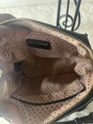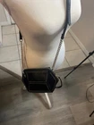 Black "Urban Expressions" crossbody bag with silver and gold stud detailing and a gold chain strap. Vegan cruelty-free handbags. IT features stud details, grommet details and gold hardware. The brand emphasizes creating fashionable and affordable alternatives to traditional leather bags. Measures 9” W x 6” H x 3” D