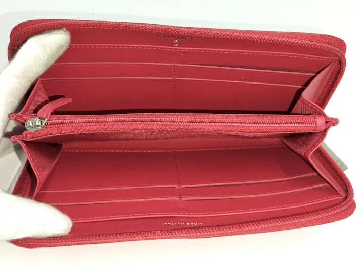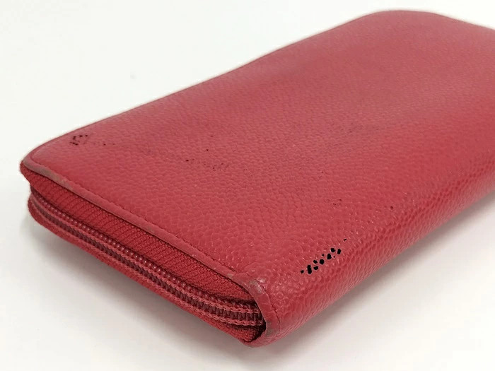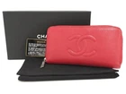 Used CHANEL Round Zipper Long Wallet Coco Mark Caviar Skin Leather Red UQ510090