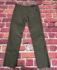 Versace V 1969 Italia jeans for men in green, size 36 x 32. These slim-fit denim jeans feature a mid-rise, bootcut style with a distressed acid wash. They have a 5-pocket design with button and zipper accents, and are made of stretchy cotton fabric. The jeans are machine washable and suitable for all seasons.