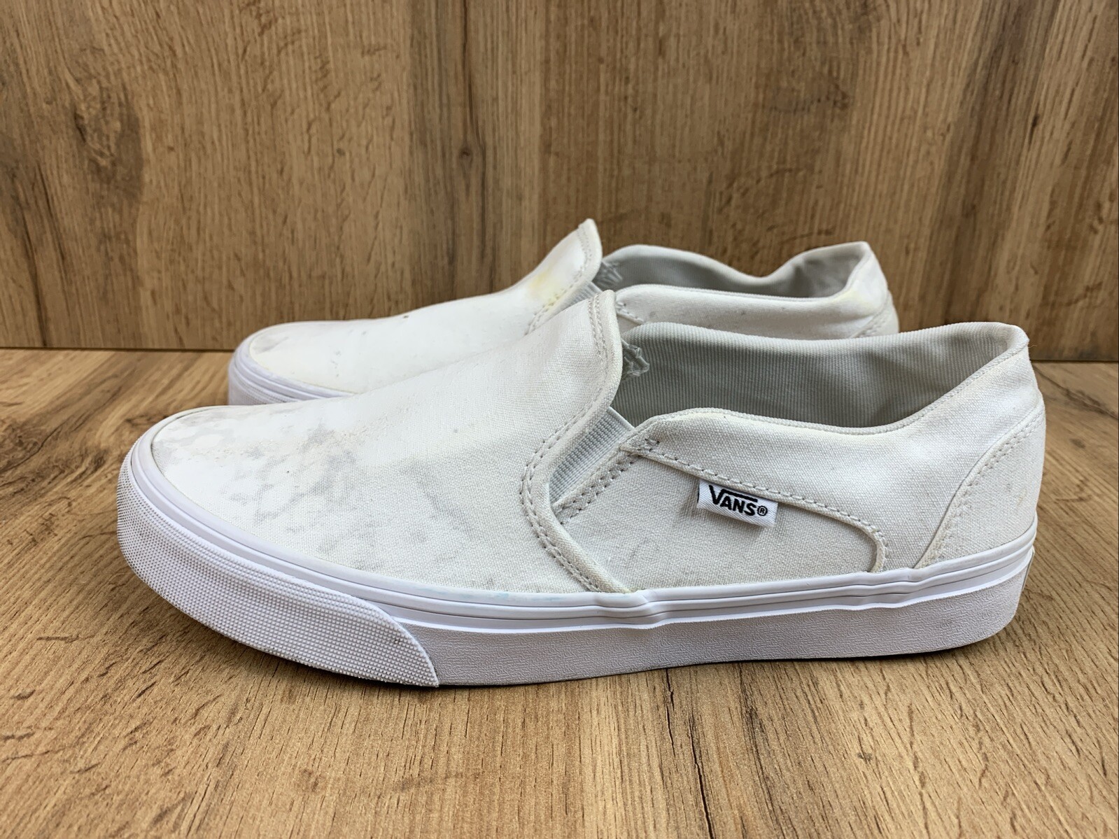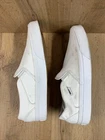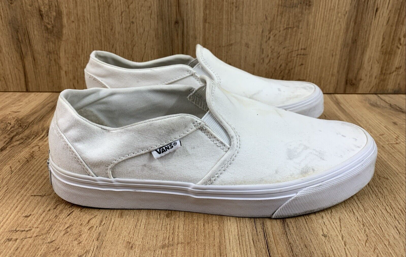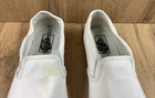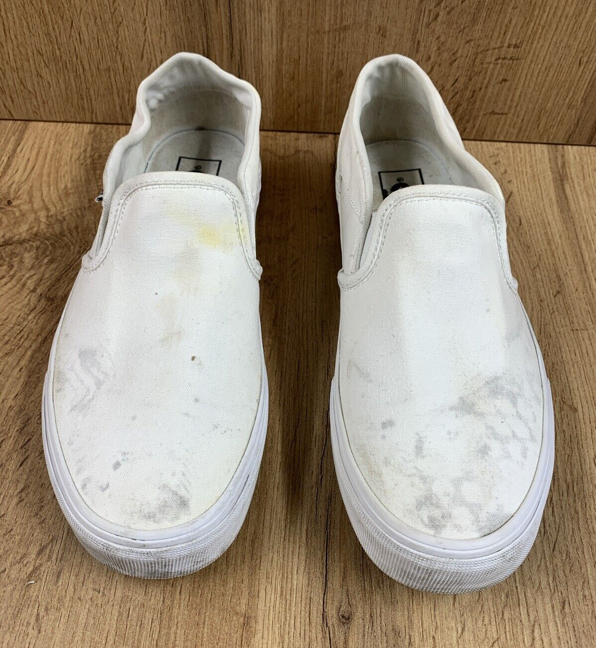 VANS Off The Wall Classic Slip On Skate Loafer Shoes Size 9 White Canvas 721356 Signs of cosmetic wear, discoloration, Mid-foot and heel tread wear, See pictures! Condition: For the most part, all of the shoe's I sell are used but, in good to great condition with a long life ahead of them. If the shoes has any noticeable issues, the issue will be presented in the photos and disclosed in the condition descriptions . No funny business at Treasures Redeemed. I know it can be daunting to buy used shoes so I want to be transparent as possible. Couple of things to consider: 1. All shoes are sprayed and disinfectant to ensure freshness. 2. No props, such as shoe trees or shoe stands are included. 3. All shoes are checked closely and vigorously for authenticity. No counterfeit will behold here! Please examine the pictures thoroughly before purchasing. I try not to hide anything and they provide the best representation of the product. Shoes does not come with the original box in most cases, instead I will be shipping them in a USPS shoebox, a large mailing box or a plain box. God bless you and your family! Enjoy!