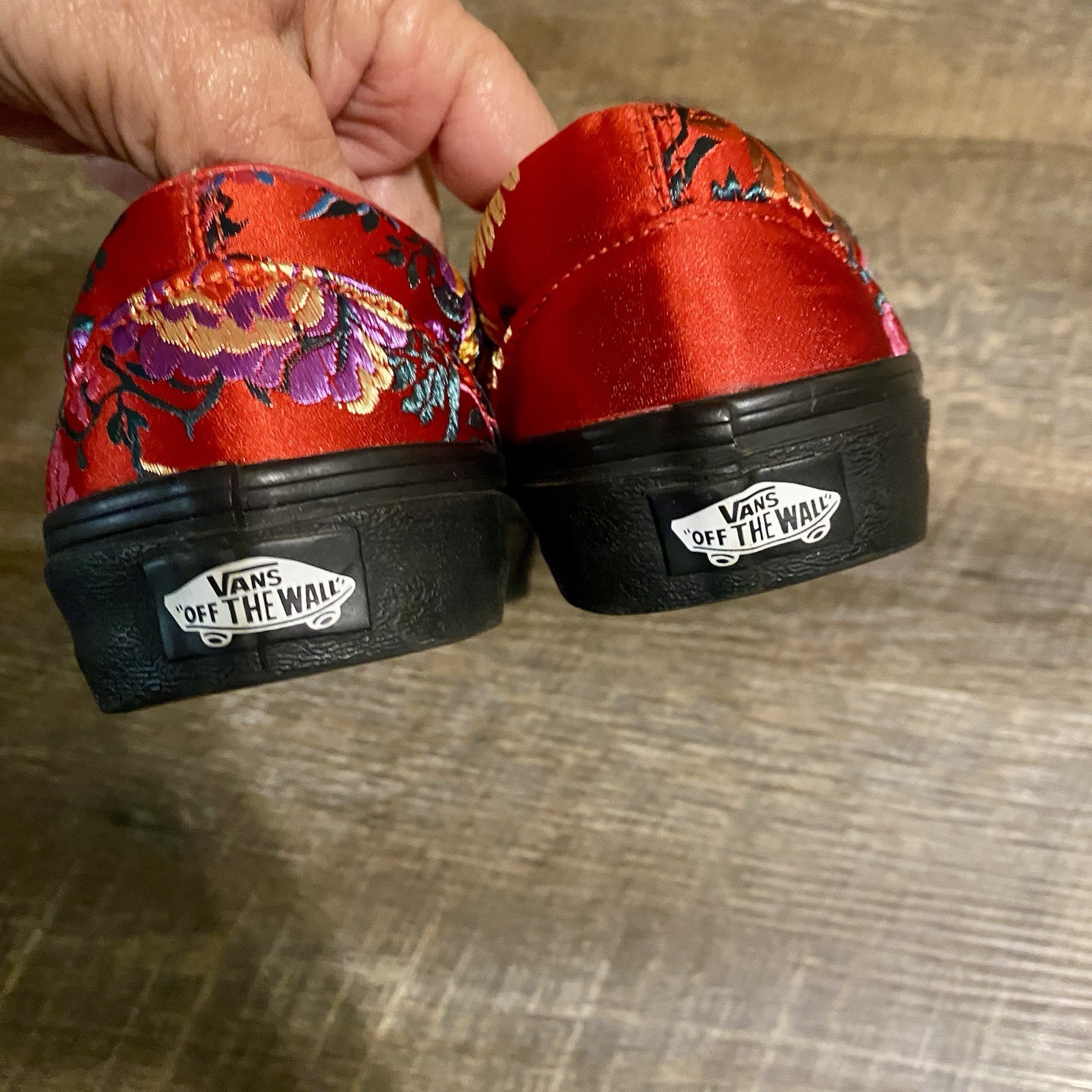 The VANS Classic Slip-On Festival Satin Size 7.5 Women's shoes are a stylish and comfortable option for casual occasions. Featuring a low top slip-on design, these sneakers are perfect for summer, fall, and spring. The multicolor canvas fabric with the Chinese New Year style code adds a unique touch to the overall look. With a rubber outsole for traction, these shoes are not only fashionable but also suitable for skateboarding and other athletic activities. Show off your festival theme with these iconic VANS slip-ons.
