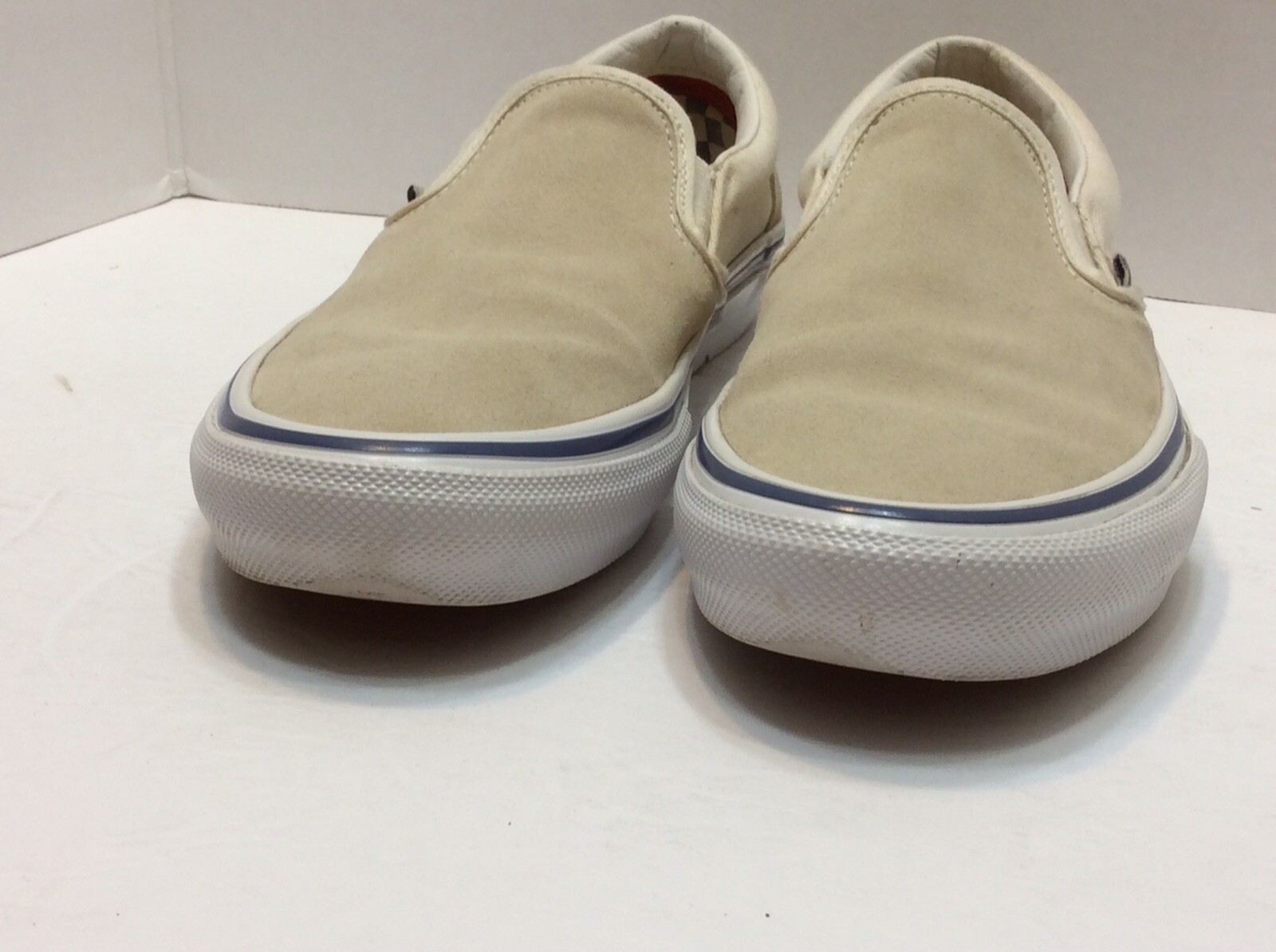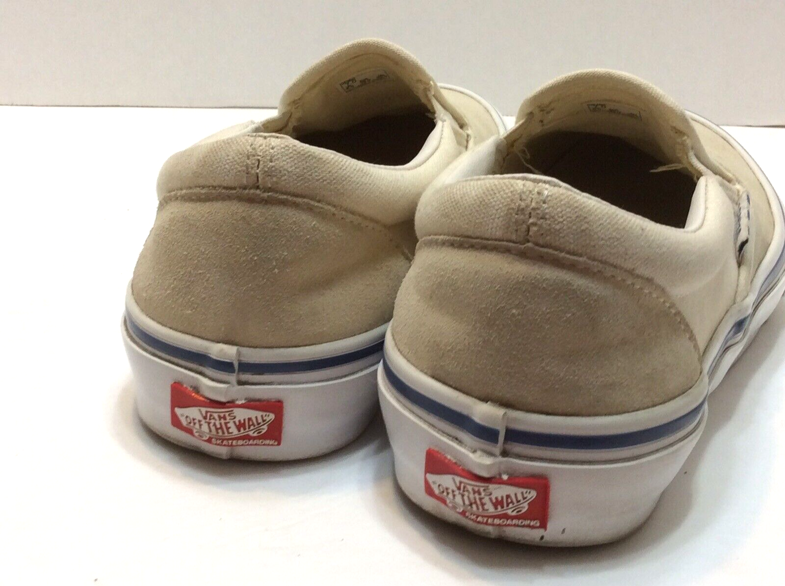 VANS Off The Wall Skateboarding Duracap Beige, Front Suede, Back Canvas Slip on loafers casual men's shoes Size: 7(US) 39(EU) 6(UK) =================================================== Listing size based on tag, printing inside shoes, or engraving on out soles Each manufacturer is different. -------------------------------------- For more details see "specifications" ITEM CONDITION: ** Pre owned items ** Good condition, showing mild scuffs on uppers Insoles showing signs of normal wear Review photos ** No Box Please check photos for general condition of these shoes. ***Check photos carefully because those are the shoes that you will receive. ---------------------------------------------------------------- PAYMENT: Payments made after 2 PM, PST item will be shipped next working day. Payments made on Saturdays, item WILL BE SHIPPED NEXT WORKING DAY. ------------------------------------------------------------------------------------- SHIPPING: Within 1 day of payment, as payment clears ------------------------------------------------------------------------------------ INTERNATIONAL BUYERS: Please check with your local postal service about extra fees, and timing of delivery. Each country works different. We offer First Class international Service which does not provide tracking service once leaves USA>. Other services up on request. Please request final shipping cost, item will be shipped in a box. ------------------------------------------------------------------------------------------ RETURN POLICY: Within 30 days of item arrival. Item(s) should be returned in the same packing and should have all original labels/tags, and not be removed. We will not process refund if item(s) shows signs of been worn/used, or any scratches/rips/tears, etc not shown in photos or in description ***ORIGINAL SHIPPING COST WILL BE DEDUCTED FROM REFUND WHEN "FREE SHIPPING OFFER" ITEMS ARE RETURNED**** Please send us an email to arrange return procedures. BUYERS RESPONSIBLE FOR RETURN SHIPPING COST. BOX#0040