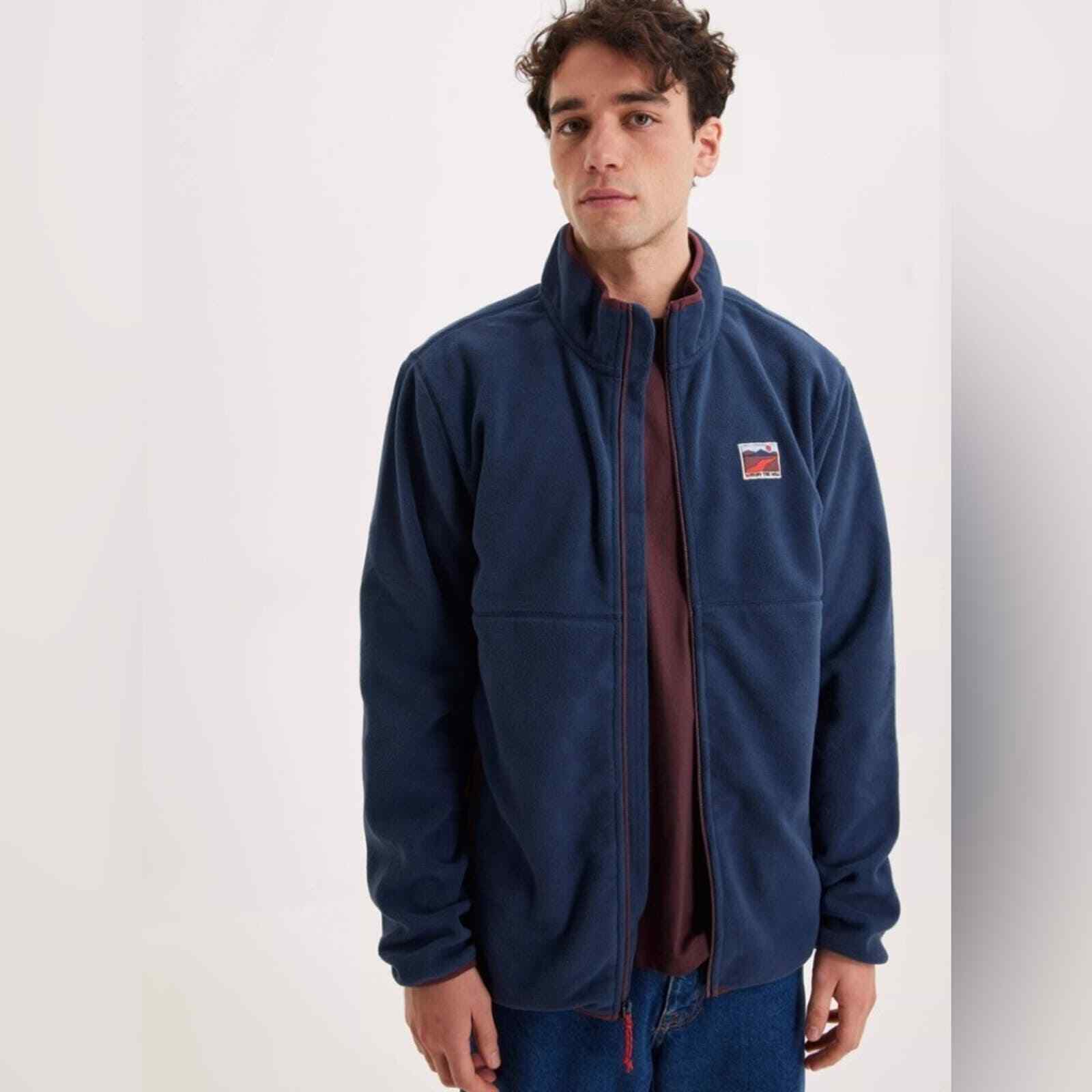 Full zip navy blue fleece jacket with burgundy trim 2 zip pockets