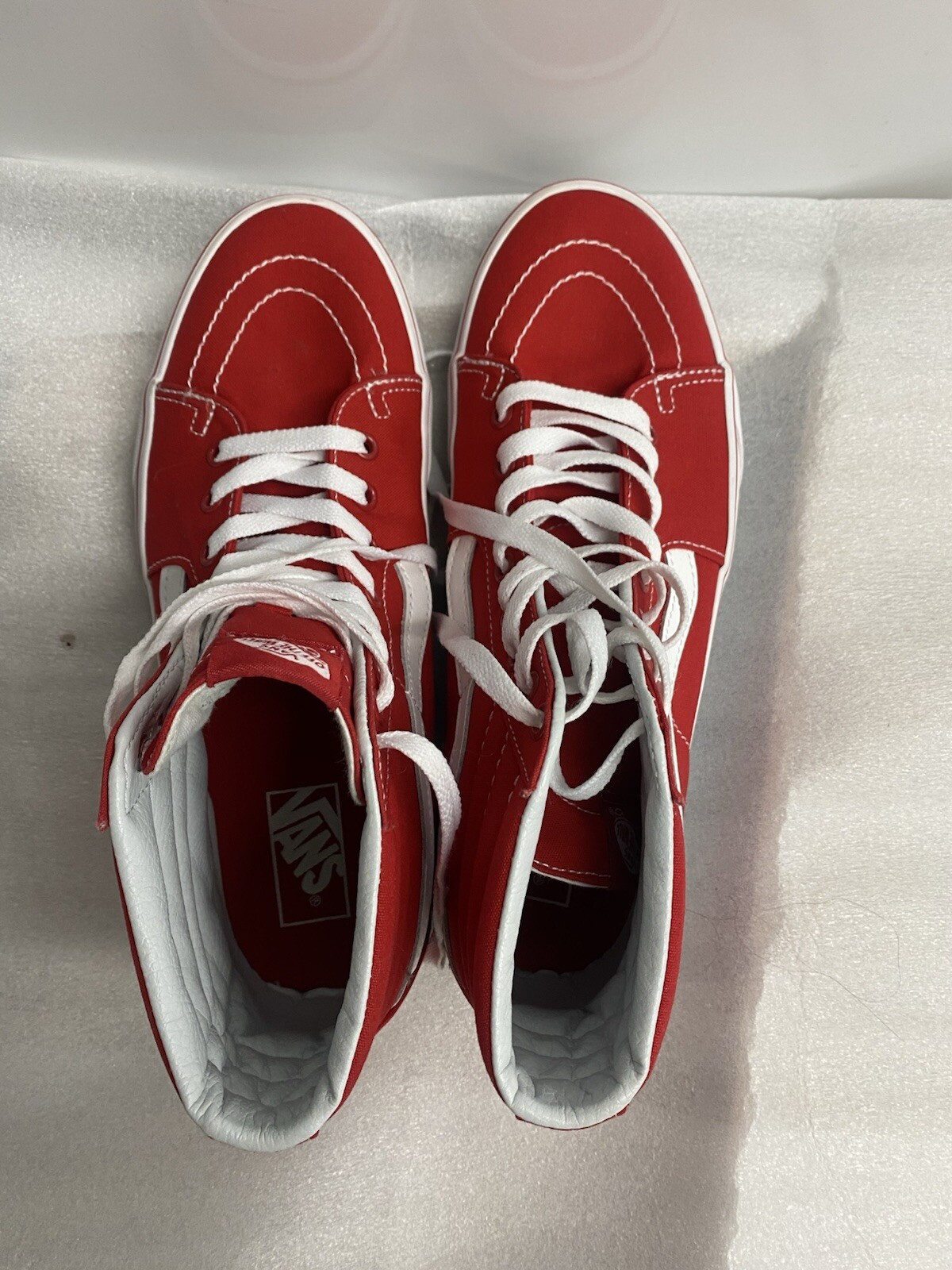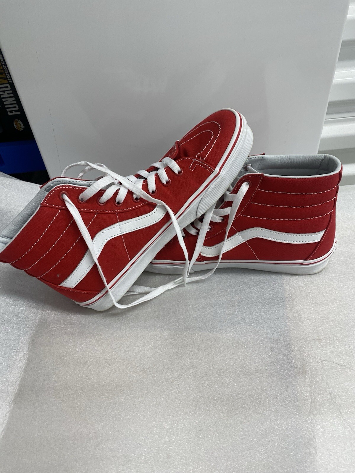 Crafted for the skateboarding enthusiast, the VANS Old Skool Sneakers are a vibrant addition to any footwear collection. In a striking red with white accents, these high-top shoes are designed for both style and function. The lace-up closure ensures a secure fit, while the renowned VANS Old Skool model merges classic design with contemporary detailing. These size 10 athletic sneakers are part of the iconic VANS Old Skool product line, celebrated for their robust construction and comfort. Perfect for active individuals, they offer the performance needed for skateboarding and the versatility to transition seamlessly into a casual urban lifestyle. They look brand new but no box. They in excellent condition . If you would like more pictures or have any questions please send me a message. Thank you