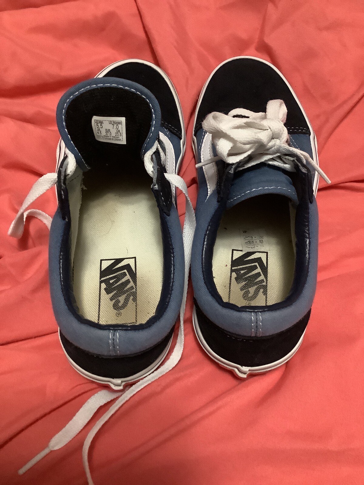 Elevate your skateboarding style with these navy and white VANS Old Skool sneakers. The low top shoe shaft style, combined with the nubuck and canvas upper material, provides a comfortable and durable fit for all your skateboarding activities. The rubber outsole material ensures a firm grip on the board, making these sneakers the perfect choice for skateboarding performance. These unisex athletic shoes, with a style code of 530714, feature a solid pattern and a blue character, adding a unique touch to your outfit. Available in US shoe size M5.5/W7.0, these VANS Old Skool sneakers are not only stylish but also practical. Whether you're a skateboarding enthusiast or simply looking for a trendy addition to your shoe collection, these sneakers are a must-have.