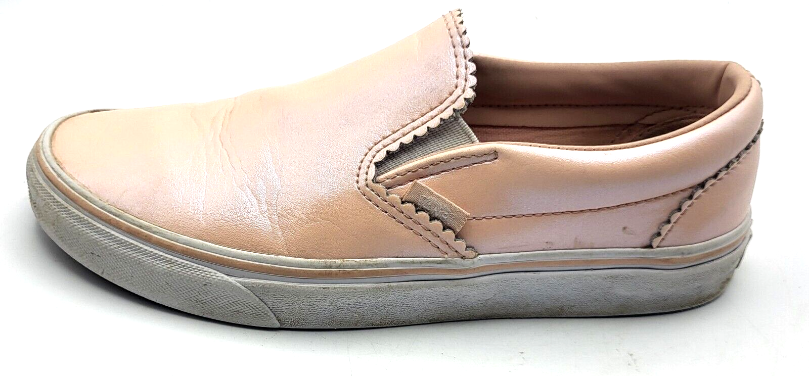 These VANS Pink Pearl Slip-on Shoes are a perfect pick for fashion-conscious women and men. The shoes are designed with a solid pattern and almond toe shape. They have a slip-on closure and a flat heel style, making them comfortable for all-day wear. These shoes are made of leather and are available in UK Shoe Size 5, US Shoe Size 7.5, and EU Shoe Size 38. They come in a beautiful pink color and are branded by VANS. With a casual style and standard shoe width, these shoes are perfect for any occasion and will surely complement any outfit.