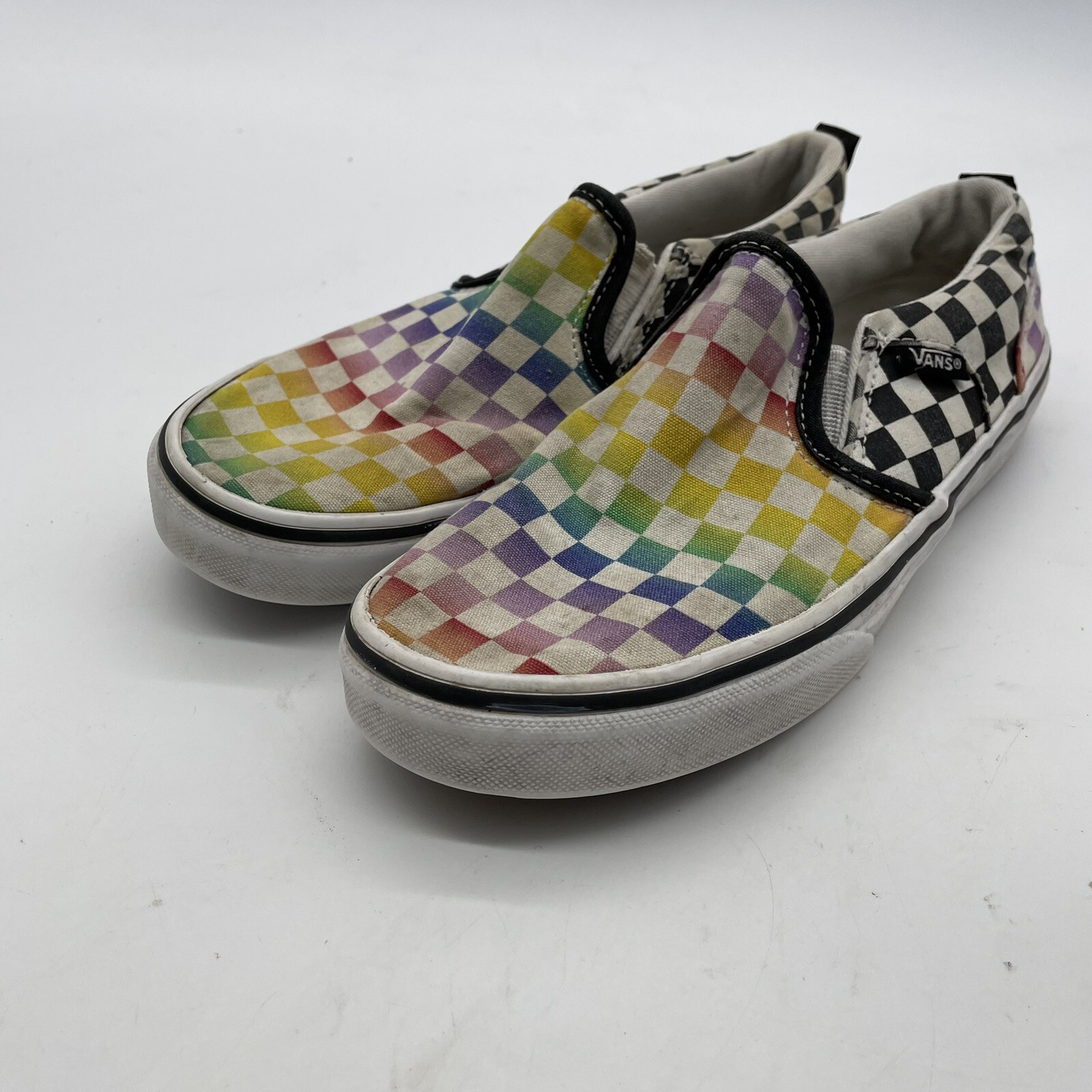 Some wear and discoloration see all pics They are made with a blended fabric material and a rubber outsole for optimal durability. The shoes are designed for unisex kids, with a US shoe size of 4 and a standard shoe width. The cushioning level is minimal, and the shoes have no vintage or handmade features. Get your child ready for any activity with these VANS Off the Wall slip-on skateboard shoes.