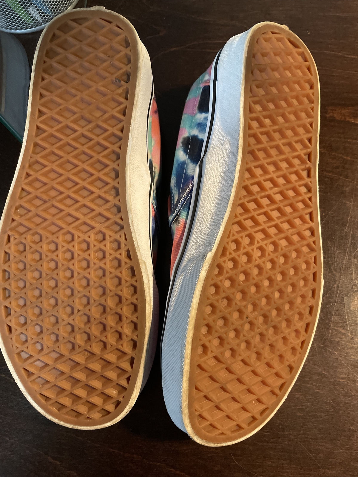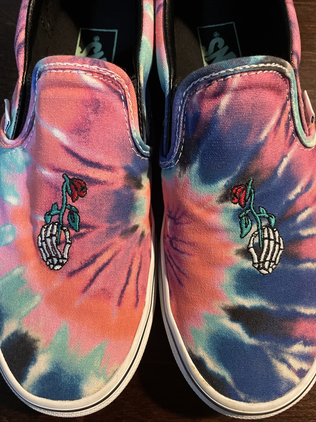 VANS Classic Slip-On Tie Dye Grateful Dead Skate Sneaker Jerry Garcia W8 M6.5. Vans Grateful Dead Tie Dye Classic Slip On Skate Shoe Sneaker. Features canvas tie dye upper with embroidered skeleton hand holding a rose in retro psychedelic style. Size Womens 6/ Mens 4.5. Great, rarely used condition