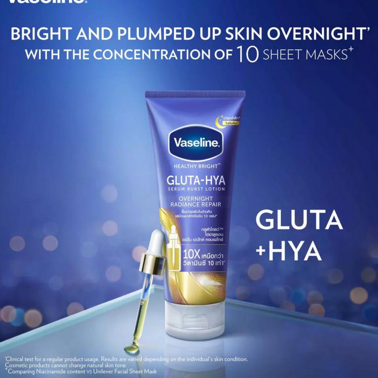 Product Description: VASELINE Gluta-Hya Serum Lotion Overnight Rad Repair Boost Skin Moist (200ml) Wake up to visibly smoother, glowing skin with VASELINE Gluta-Hya Serum Lotion Overnight Rad Repair Boost Skin Moist. This unique serum lotion is designed to work while you sleep, providing intense hydration and skin repair to help restore and renew your skin, leaving it feeling soft, healthy, and nourished. Features: Gluta-Hya Formula: A powerful combination of Glutathione and Hyaluronic Acid, known for their skin-brightening and moisturizing benefits. This formula works overnight to repair and hydrate your skin, leaving it revitalized and glowing. Overnight Repair: Formulated to boost skin repair while you sleep, helping to restore skin's natural radiance and texture. Deep Hydration: Delivers long-lasting moisture, preventing dryness and leaving your skin feeling soft and supple. Light, Non-Greasy Texture: The lightweight, non-greasy formula absorbs quickly, providing instant hydration without a heavy feel. Suitable for All Skin Types: Gentle and effective, this lotion is suitable for all skin types, including dry and sensitive skin. Benefits: Brightening Effect: Helps reduce skin dullness and enhances overall radiance with regular use. Intense Skin Repair: Works overnight to repair and nourish damaged skin, improving texture and tone. Soft, Moisturized Skin: Enjoy deeply hydrated and soft skin that feels smooth and refreshed by morning. How to Use: Apply the lotion generously to clean, dry skin before bedtime. Massage gently in upward circular motions to ensure even coverage. Allow the formula to absorb overnight as it works to repair and hydrate your skin. Use regularly as part of your nighttime skincare routine for best results. Shipping Options: Orders will be processed and shipped within 3 business days after payment is confirmed. You have the option to choose between economy shipping and express shipping. Economy shipping is provided at no additional cost, while express shipping incurs an extra fee. When placing your order, you can select your preferred shipping method. Express shipping offers faster delivery, with an estimated delivery time of 3 to 6 days. Economy shipping typically takes up to 21 days for delivery. Please be aware that shipping times may be extended during peak holiday periods such as Christmas and Chinese New Year. Returns: Buyers are responsible for return shipping costs unless the return is due to an error on our part. Returns must be initiated within 30 days of purchase. Processing a return may take up to 7 business days. Additional Information: For any inquiries, please reach out via the "Ask the seller a question" link, and we will reply within one business day. Refunds cannot be issued once the 30-day return period has passed. Tax and Customs: Any customs or import duties are the sole responsibility of the buyer.