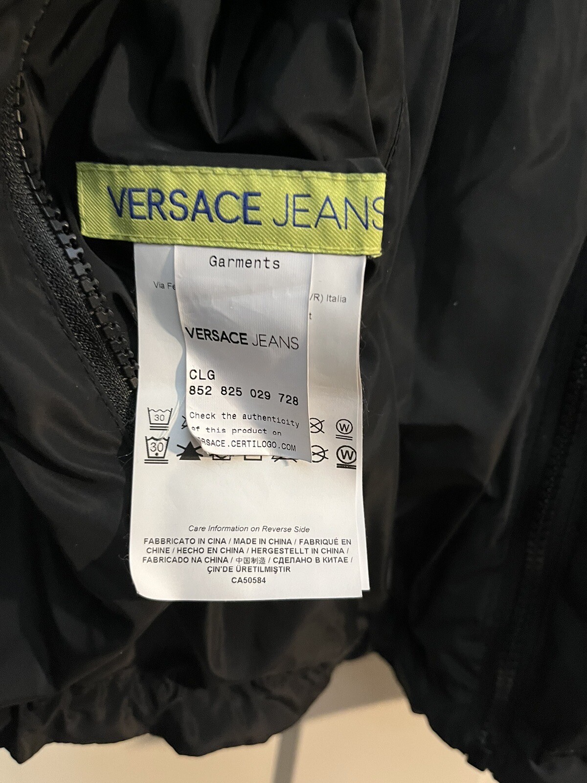 Designer Versace lightweight windbreaker style jacket with hood. Women Size M. Black with ‘Versace’ logo on back (see photo). Reversible is black and gold Barocco print. Multiple zippered pockets. Authentic Versace zipper tag. Certified Logo Authenticity provided to Buyer by Versace. Timeless style.