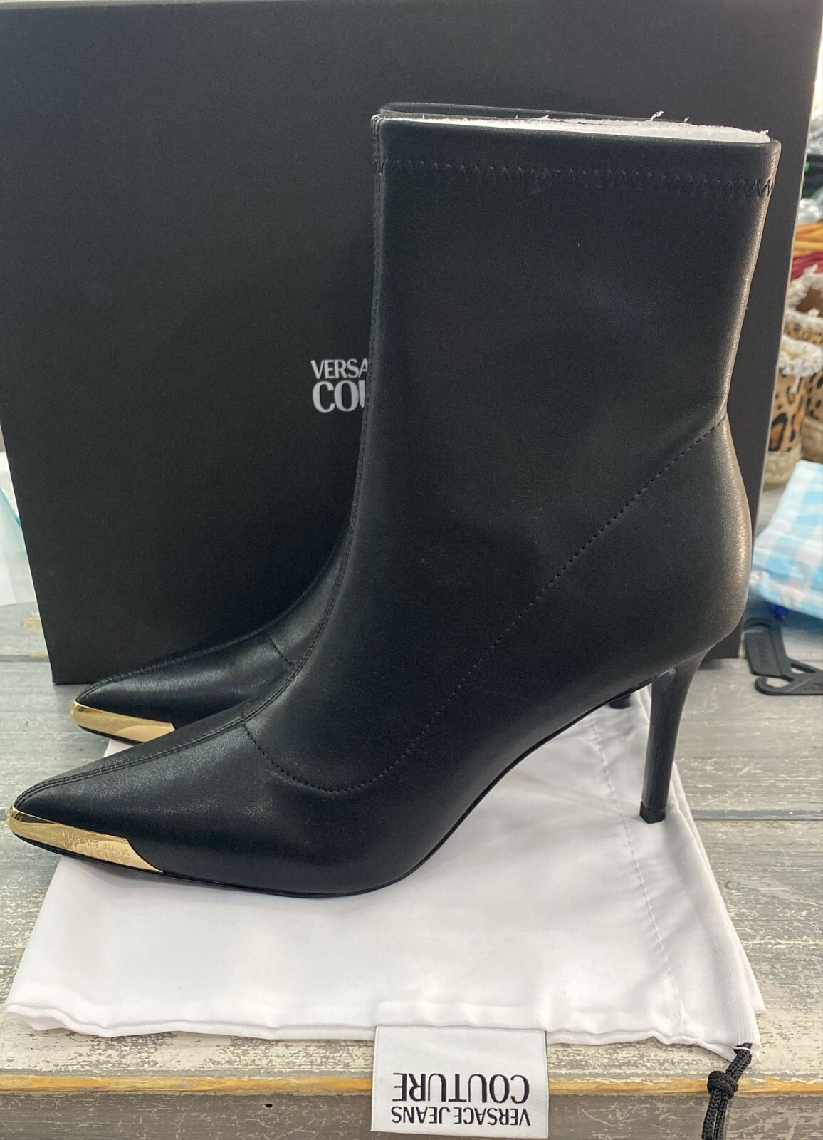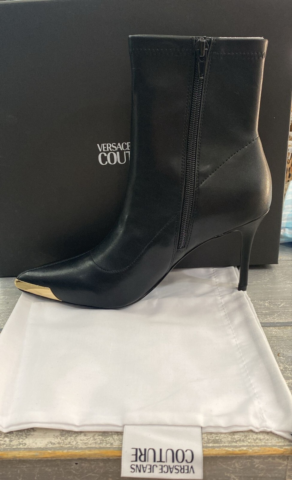 Forme de la pointe:PointeDépartement:FemmeMatériel de doublure:Cuirgtin13:Non applicableCouleur:NoirEAN:Non applicableSur mesure:AucunMatière de la couche extérieure:CuirType:escarpinsHauteur du talon:7 cmVintage:NonStyle de talon:AiguilleMatière de la semelle intérieure:cuirMarque:Versace Jeans CoutureStyle:BottinePointure EU:38