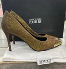 $ 26.4CHANEL Black Gold Patent Leather Interlocking CC Peep-toe Heels Pumps 37 RARE