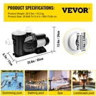 Document Product Description 2.5HP 1850W Swimming Pool Pump High-Efficiency Copper Motor & Security Design & Tested toStandards The swimming pool pump is equipped with a pure copper motor, high efficiency, and low noise, serving you for a long time. Furthermore, the pump shell is made of premium ABS and aluminum material, sturdy and corrosion-proof, without water leakage. In addition, , suitable for swimming pools, spas, bathing tubs, etc. Premium Swimming Pool Pump 2.5 HP Copper Motor Superior Performance Secure Design Tough Equipment & Tools, Pay Less VEVOR is a leading brand that specializes in equipment and tools. Along with thousands of motivated employees, VEVOR is dedicated to providing our customers with tough equipment & tools at incredibly low prices. Today, VEVOR's products are sold in more than 200 countries and regions with 10 million plus members worldwide. Why Choose VEVOR? Premium Tough Quality Incredibly Low Prices Fast & Secure Delivery 30-Day Free Returns 24/7 Attentive Service Key Features 1850W Copper Motor The pool pump adopts a pure copper motor to achieve high efficiency and long service time. Power: 1850W/ 2.5 HP, Voltage: 110V / 60Hz, Amps: 16 A, Capacitor: 25 F. High-Efficiency Performance Our pool pump is suitable for pools up to 100,000 liters, which can meet your daily needs. Max. Head Lift: 62.34 ft, Max. Flow: 560 L/m. It is certified with . Silent & Secure Design The pool pump will not disturb you when working; noise level: <65dB. In addition, there is a built-in thermal protector and automatic pressure control in the pump for secure operation. Removable Filter Basket The swimming pool pump features a detachable filter basket for filtering debris in the water, such as hairs, leaves, gravels, etc. So you can enjoy crystal limpid water fun and relax. Aluminum & ABS Casing The casing of the pump adopts solid ABS and aluminum material, sturdy and corrosion-proof. In addition, the housing is sealed by an industrial process without water leakage, keeping the motor and internal device intact. Versatile Uses The in-ground pool pump has a wide application for many occasions. For example, you can install it in a swimming pool, bathing pool, landscape pool, spa tub for efficient crystal clear water circulation. Specifications Model: SPP250A Power: 1850W/2.5HP Voltage: 110V / 60Hz Amps: 16 A Capacitor: 25 F Max. Flow: 560 L/m Max. Head Lift: 19 m / 62.34 ft IP55 INS CL.F: Max. 50 C Noise Level: <65dB Inlet: 1.5''/3.8 cm Internal Outlet: 1.5''/3.8 cm Internal Product Size: 25.6 x 6.7 x 13.4 in / 65 x 17 x 34 cm Weight: 22.5 lbs/10.2 kg Package Content 1 x Swimming Pool Pump 1 x User's Manual Features & Details Premium Swimming Pool Pump: The self-priming pool pump has brilliant performance with CE, FC certification. It is suitable for pools of up to 100,000 liters and can serve you for long time. 2.5 HP Copper Motor: The swimming pool pump is equipped with a pure copper motor for high efficiency, low noise, and long service time. The pool pump power: 1850W/2.5 HP, capacitance: 25 F, Amps: 16 A, voltage: 110V/60Hz, security rating: IP55. Superior Performance: The pool pump adopts an S-Tek flow system with a maximum head lift of 62.34 ft and a maximum flow rate of 560 L/min. In addition, the filter basket in the pump can effectively filter debris in the water to provide clean water, such as hair, leaves, gravels, etc. Secure Design: The housing of the pump is made of sturdy ABS and aluminum material, durable and corrosion-proof, preventing the motor and internal device from damage. Moreover, the pump is designed with a built-in thermal protector and automatic pressure control for security. Versatile Uses: The in-ground pool pump can be used on many occasions for providing high-efficiency water circulation and crystal clear water, such as swimming pool, bathing pool, landscaped pool, spa, etc. People Who Bought This Item Also Bought VEVOR Swimming Pool Pump Above Ground Pool Pump 2 HP 90 GPH w/ Strainer VEVOR 1.5HP Swimming Pool Pump Motor w/Strainer Generic Above Ground 1100W VEVOR Swimming Pool Pump Above Ground Pool Pump 1.5 HP 90 GPM w/ Strainer VEVOR Swimming Pool Pump Above Ground Pool Pump 2 HP 92 GPM w/ Strainer VEVOR Sand Filter Above Ground with 3/4HP Pool Pump 3000GPH Flow 14" 6-Way Valve VEVOR Swimming Pool Pump Above Ground Pool Pump 1.5 HP 88 GPH w/ Strainer VEVOR Sand Filter Above Ground with 1 HP Pool Pump 3500 GPH Flow 16" 6-Way Valve VEVOR Deep Well Pump 4" 1.5HP Submersible Pump Max 390' Head w/ 131 ft Cable VEVOR Macerator Disposal Pump Basement Macerator Pump 300W with 3 Water Inlets VEVOR 12V Water Pressure Diaphragm Pump Self-Priming Pump 70 PSI 5.5 GPM Boat Car VEVOR 1/2HP 4" Deep Well Pump Submersible Stainless Steel 164FT 25.5GPM 110V VEVOR 12V Water Pressure Diaphragm Pump Self-Priming Pump 55 PSI 3.5 GPM Boat RV VEVOR Sand Filter 16" Above Inground Swimming Pool Sand Filter with 7-Way Valve VEVOR 110V Water Pressure Diaphragm Pump Self-Priming Pump 45 PSI 3.3GPM Boat RV VEVOR Shallow Well Jet Pump 0.75 HP 18.5 GPM w/Pressure Switch Stainless Steel SHIPPING ABOUT US PAYMENT RETURNS CONTACT WARRANTY Welcome to our eBay store. As a leading and emerging company in manufacturer and exporting business, we are specialized in Business and Industrial Products, Sporting Goods, Pet Products, Home and Garden products for more than 10 years. We believe that it is our vision and mission to provide innovative products with best service and competitive price to satisfy you. Our goal is to make sure that you can find exactly what you are looking for and make it easy for you to place your orders. We accept PayPal payment,PayPal Credit,Credit card or debit card and so on. Payment should be completed within 4 (Four) days of auction closing. Or unpaid dispute will be filed for closing auction. We will leave a positive feedback immediately after payment is received. We appreciate a positive feedback as much as you do. If for some reason there is any issue with the 