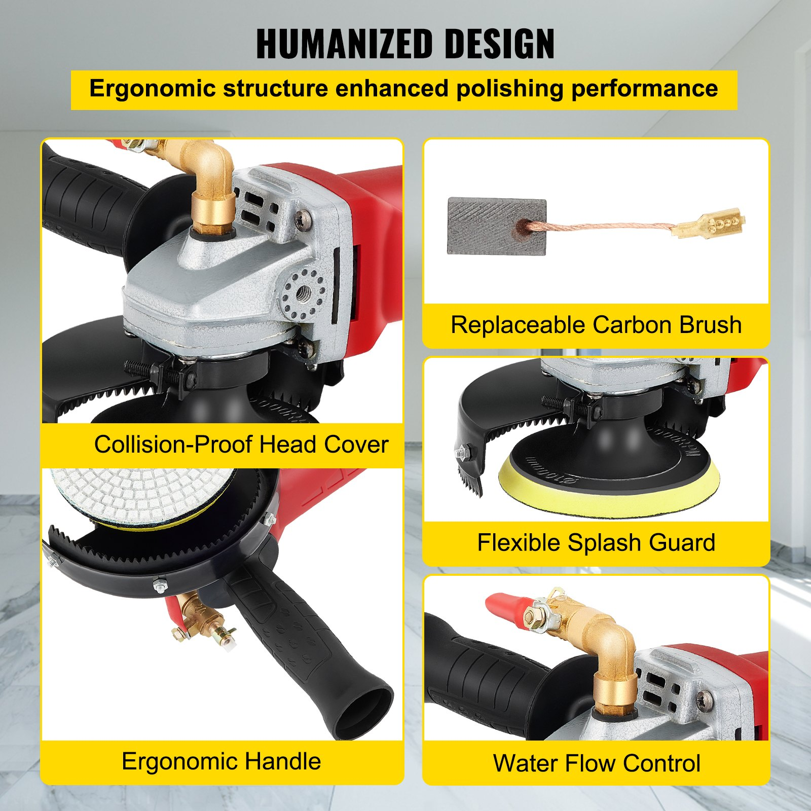 VEVOR Wet Buffer / Polisher, Variable Speed 8 pcs Kit, Extra 4" & 5" Diamond Polishing Pads , Buffing Machine w 59" Pipe Adapter & Splash Shield, Concrete Stone Tool for Granite/Marble Countertop CE VEVOR Wet Buffer / Polisher, Variable Speed 8 pcs Kit, Extra 4" & 5" Diamond Polishing Pads , Buffing Machine w 59" Pipe Adapter & Splash Shield, Concrete Stone Tool for Granite/Marble Countertop CE 860W Powerful Motor 6 Variable Speeds Control Complete Accessories Easy On/Off Switch & Soft Start Water Injection Adjustable Effective Heat Dissipation Item Dimensions (L x W x H): 22.4" x 17" x 12" / 57 x 43 x 30 cm,Water Injection Holes: 3,Water Pipe: 59" / 1.5 m,Color: Red,Polishing Wheel Diameter: 4" / 100 mm,Volt: 110V 50-60 Hz,Material: Aluminum,Water Injection Mode: Up,Adjustable Shift Gears: 6,Output Thread: M14,Model: Wet Polisher 8pcs Pads,No-Load Speed: 5000 RPM,Net Weight: 8.5 lbs / 3.9 kg,Power: 860W