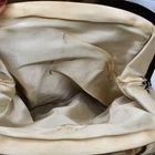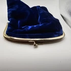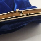 The VG Vintage 1950's INGBER Blue Velvet Clutch Purse is a classic piece with a kissing gold tone clasp, perfect for adding a touch of vintage glamour to any outfit. The royal blue exterior, accented with aged metal hardware, exudes a designer feel, while the satin lining in gold adds a luxurious touch. This medium-sized clutch is ideal for carrying in the city, with a solid pattern and timeless style that is sure to make a statement. There are stains inside. See photos for imperfections sold as is