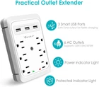 VICOUP Socket Shelf Surge Protector Adapter with 6AC Outlet 3 USB Port Extender Outlet Extender with Shelf: 6 AC outlets with 1080J Surge protector, 3 USB ports(5V/3.4A total), Safety ground indicator Light, surge protection indicator light, 1 hanging hole for all types of Standard Electrical Outlets, like duplex outlet, GFCI outlet, Decor outlet, USB receptacle. Can use screw to secure it onto standard Electrical Outlets. Multi Outlet with Create Extra Space:Fit all types of Standard Electrical Outlets, just plug in. Use the included screw to secure it onto the wall. now you have a sturdy shelf. The 8.1’’ x 3.3" shelf is great for hold a variety of household items including Alexa, iPhones, Androids, smartphones, tablets, wireless charging, electric toothbrushes, Sonos, razors, toothpaste, spices, and so much more! USB Wall Charger: 3USB charging ports (total output DC 5V/3.4A total), 5V 2.4A Max per port shared rating; high-speed USB ports automatically detect charging devices and deliver optimal charging speed, up to 2.4A per port. Fits for iPhone Xs/XS Max/XR/X/8/7/6/Plus, iPad Pro/Air 2/Mini 3/Mini 4, Samsung S4/S5, and more. Surge Protector Outlet: The multi plug outlet provide surge protector against electrical spikes. Three complementary Surge Protection Circuits, TVS(transient voltage suppressor) MOV(metal oxide varistor) GDT(gas discharge tube), with response speed less than 1Ns, and minimum energy-absorbing capacity of 1080 Joules, its response time is much shorter than the traditional MOV surge protector circuit, It truly provides great protection of your precious plugged-in devices. Our After Sale Service: ETL Certified,Our friendly and reliable customer service will respond to you within 24 hours. You can purchase with confidence, with our 30-day return and 12-month replacement. Specifications: Input Voltage: 100-240VAC; 60HZ; Max.Current: 15A; Max.Power Rating: 1875W; USB Port Output: DC 5V, Total 3.4A; Item Dimensions: 5.74 x 3.74 x 1.20 inches Material: Fire-resistant ABS Electrical Rating: 125V/15A/1875W Joule Protection Rating: 1080J Output Per USB Port: DC5V-2.4A Max USB Total Output: DC5V -3.4A 17W Package list: 1 x Electric Wall Outlet with USB Charger; 1 x Instruction manual; 1 x Paper Box; Notice: Do not exceed the total rating or it may cause damage to the unit and fire hazards Payment Delivery details Feedback Returns Contact us Payment We accept PayPal as our preferred method of payment. Delivery details 1)Orders will be processed and dispatched within 24-48 hours after payment is clear. 2)We only ship to confirmed eBay addresses. Please make sure your eBay address matches your Shipping address. Feedback Your feedback is our encouragement. Please DO NOT leave us a Neutral/ Negative feedback, or open a case before contacting our customer service by "ebay message", it is not a solution which is suggested by the ebay regulation. Message us first, we will make sure to solve your any concern or issues. Returns 1)Return is accepted within 30 days after the buyer's receiving the item 2)If you are not completely satisfied with your purchase, you may return it to us for a prompt exchange or we will refund your payment 3)Delivery fees will not be refunded.Please understand that shipping and handling fee back to seller is not refundable. Buyer is responsible for shipping costs incurred shipping products back (if products damaged when arrived or not match our advertisement, seller will pay the shipping fee for sending item back) Contact us 1)If you have any question, Please contact us by ebay message(not e-mail). we will reply to you within 48 hours. 2)We care about our valued buyers, if you have any questions, our Customer Service staffs will be very glad to help you. We try our best to reply to your mails as soon as possible; however, due to high volume of daily incoming emails and time zone difference, we may not be able to reply your emails immediately. Please allow 48 business hours for us to response.
