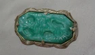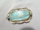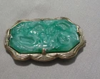 A PRETTY VICTORIAN BROOCH FAUX JADE . GOLD TONE FRAME IN VERY LT. COLOR GOLD TONE. MOLDED FLORAL DESIGN. SIZE 2 INCH BY 3/4 INCH WIDE.