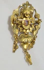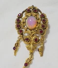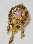 A BEAUTIFUL VINTAGE BROOCH, WITH PINK FAUX OPAL CENTER AND RED GARNET CRYSTAL STONES ALL AROUND THE FRAME AND DROPS. GOOD PRE OWNED CONDITION, ALL STONES ORIGINAL TO THE BROOCH.