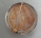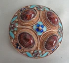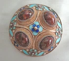WOW, LOVE THIS BEAUTIFUL CIRCLE BROOCH WITH DARK AND LIGHT BLUE ENAMEL WITH OVAL SHAPE STONES WHICH I BELIEVE ARE JASPER BEZEL SET IN SILVER FRAME, WITH GOLD GILT.