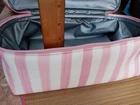 Unwind at the beach or poolside in style with the Victoria's Secret Pink Striped Cooler/Tote Bag. This versatile accessory doubles as a tote and cooler, making it an ideal travel companion for your summertime escapades. Its playful striped pattern and vibrant pink hue are sure to stand out, while the gold-tone hardware adds a touch of elegance. Crafted with functionality in mind, this bag features an open-top design for easy access, insulated lining to keep your drinks cool, and an outer mesh pocket for added storage. The double canvas handles ensure comfort when carrying, and the iconic Victoria's Secret logo straps accentuate the bag's chic appeal. It's more than just a bag; it's a statement piece for the woman on the go.
