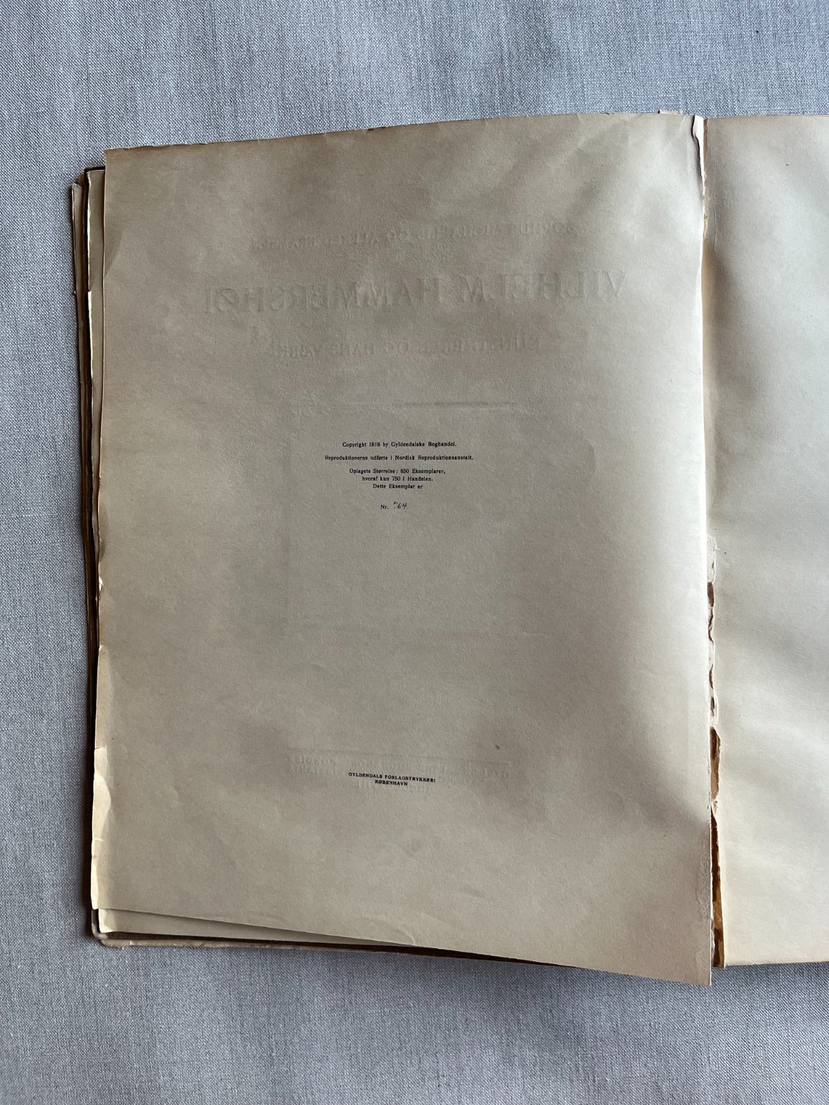 VILHELM HAMMERSHØI (1864-1916), KUNSTNEREN OG HANS VÆRK (THE ARTIST AND HIS WORK) SOPHUS MICHAËLIS & ALFRED BRAMSEN 1ST ED. NUMBER 764 OF 850 COPIES PUBLISHED BY GYLDENDAL, 1918 114 PAGES 66 MOUNTED ILLUSTRATIONS DANISH LANGUAGE BINDING WITH SIGNS OF WEAR 25 X 33 X 4 CM