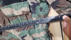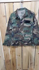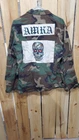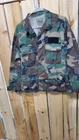 This vintage US Army jacket features a green camouflage pattern with a skull print, size M. Made of knit cotton fabric, it has a stand-up collar with button accents and pockets. The jacket is designed with a military style, suitable for workwear or casual wear. Perfect for all seasons, it carries an authentic army theme and is ideal for activities like gym training and cross training.