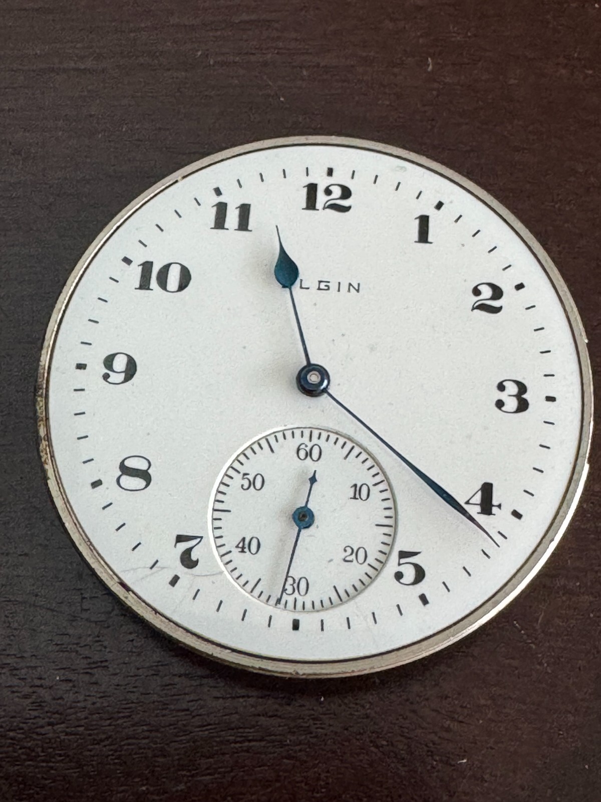 VINTAGE 12 SIZE ELGIN POCKET WATCH MOVEMENT GR. 314 KEEPING TIME DIAL IS HAS A FEW HAIRLINES Elgin National Watch Co. Grade: 314 Manufacturer: Elgin Manufacturer Location: Elgin, Illinois Movement Serial Number: 20293182 Grade: 314 Model: 2 Class: 113 Estimated Production Year: 1918 Run Quantity: 2,000 Grade/Model Run: 147 of 235 Grade/Model Total Production: 323,000 Size: 12s Jewels: 15j Jewel Setting: Screw-Set Movement Configuration: Hunting Movement Finish: Nickel Movement Setting: Pendant Wind Mechanism: Pendant Plate: 3/4 Plate Double Roller: Yes Barrel: Going Balance Type: Expansion Balance Jewel Material: Ruby Train: Quick Regulator: Moseley Hairspring: Breguet Standard Dial Type: Single-Sunk Adjusted: No Railroad Grade: No U.S. Patents: 596407 , 77078 , 585025 Case: Various Run ID: 10233.314G147.12S1449.122M709.H5960.P7463.15J2945 Data Research: 1927/1950 Elgin Serial List Database Version: v52.642
