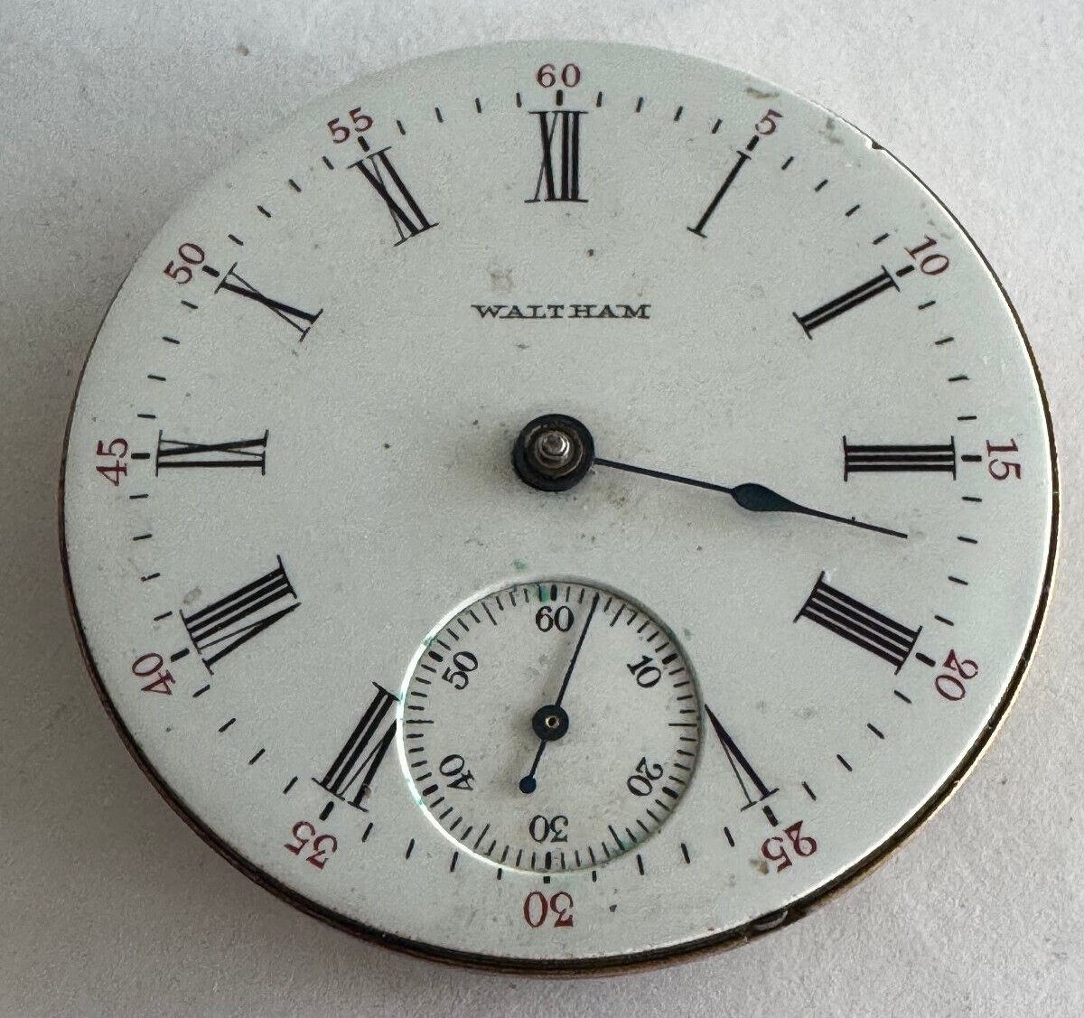 VINTAGE 18 SIZE WALTHAM POCKET WATCH MOVEMENT GR.85 RUNS FACE DOWN NOT UP MOVEMENT: RUNS FACE DOWN NOT UP, STAFF SEEMS GOOD, HUNTING, WINDS AT 3, LEVER SET, GILT MOVEMENT, YEAR 1904 DIAL: I SEE NO HAIRLINES, A COUPLE CHIPS ALONG EDGE, MISSING MINUTE HAND GRADE: 85 JEWELS: 17J S/N: 14069373 Remember to save us on your FAVORITE SELLERS list! YOUR FEEDBACK IS VERY IMPORTANT TO US! Please take a short time to tell us how we are doing! It's our goal to maintain high customer satisfaction rating If you have any questions, comments or concerns, please don't hesitate to contact us We will do our very best to be prompt to answering your questions ARE YOU NOT SATISFIED WITH THE TRANSACTION?? Before leaving us negative feedback, please contact us! We may be able to come up with a solution that will please both of us! Thank you and please visit our eBay store again! NDD SALES, INC Return Policy: Returns accepted up to 14 days. The buyer is responsible for return shipping charges. No returns on watches stated as new. Payment Information: We accept payment by PayPal only. International Buyers: Buyer is responsible for any customs fees or duties incurred by their country based on their country's rules and regulations. No exceptions!