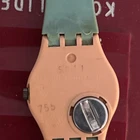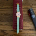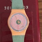 This vintage Swatch watch from 1986, known as "PINK FLAMINGO," features a pink bezel and dial with no hour marks and a teal one-piece plastic strap. It is a classic round wristwatch designed for women, with a Swiss quartz movement and water resistance up to 30 meters. The model belongs to the Swatch Originals collection and includes features like a 12-hour dial and Swiss Made craftsmanship. Please note that the watch needs a new battery and does not come with papers or original packaging. Presumably only needs battery