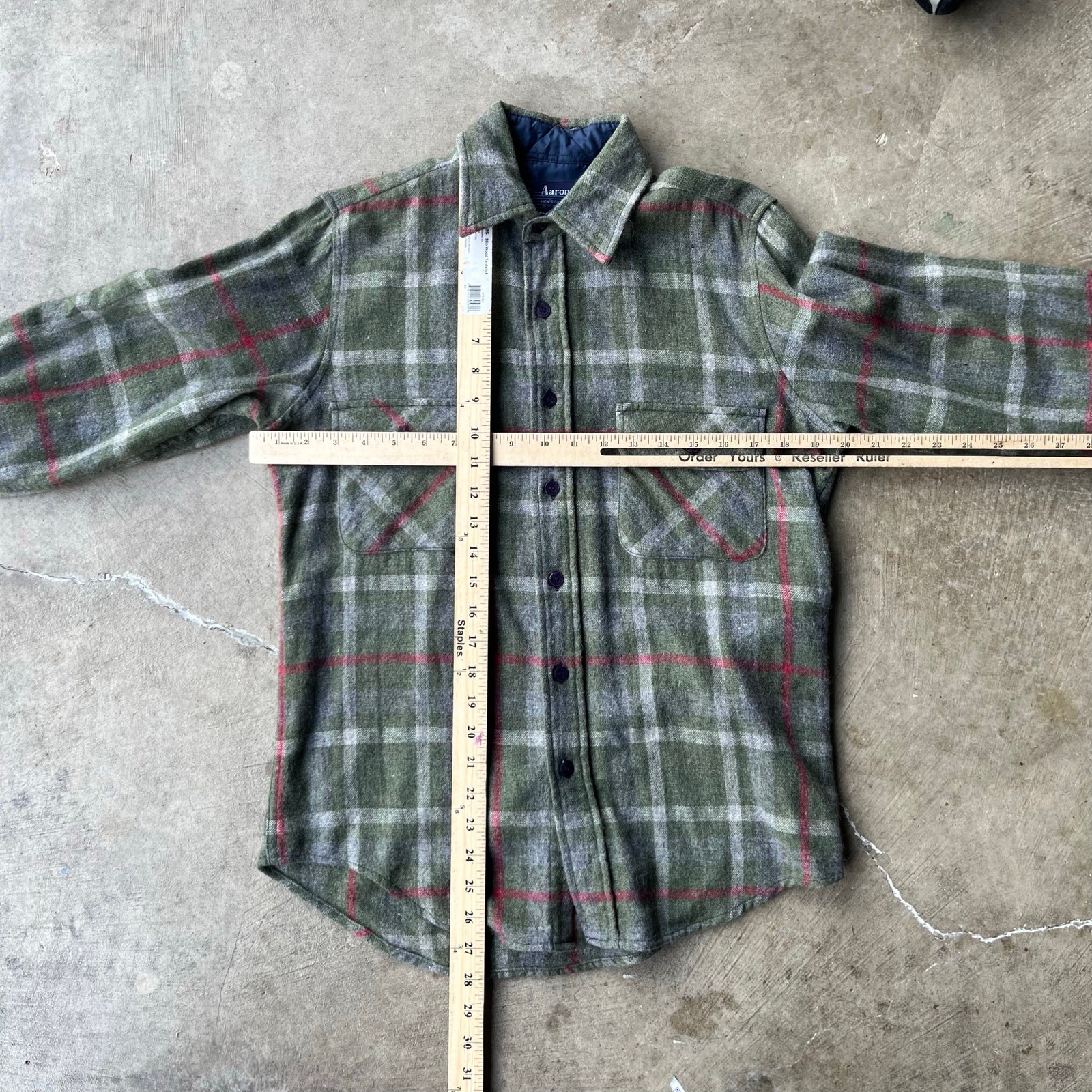 VINTAGE AARONS GREEN WOOL PLAID FLANNEL SHIRT 80S SMALL beautiful color measurements, and tag shown in pictures item is preworn and may have defects shipping every wednesday and sunday