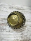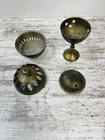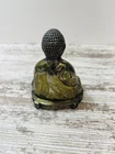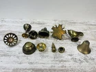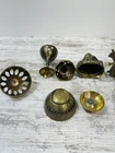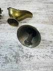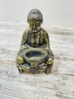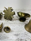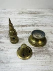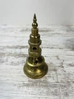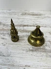 There are six incense burners, one spire that is a part of another brass object, and one bell, they are all brass except for the Buddhist monk. They all have been used and have a wonderful patina. The small one that is pictured with the spire sitting on top of it looks to have had a crown, but no longer does. It is also a bell.