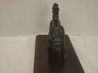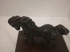This vintage cast iron horse statue, numbered 831, is a beautiful addition to any collection. With a base measuring 6.75"x4.25" and a statue size of 6"x3.5"x1.5", it is the perfect size to display on a shelf or mantle. The intricate details of the horse's mane and tail bring it to life, making it a truly unique piece. Crafted from durable cast iron, this figurine will stand the test of time. It is a great find for collectors, especially those interested in horse memorabilia. Add this stunning statue to your collection today!