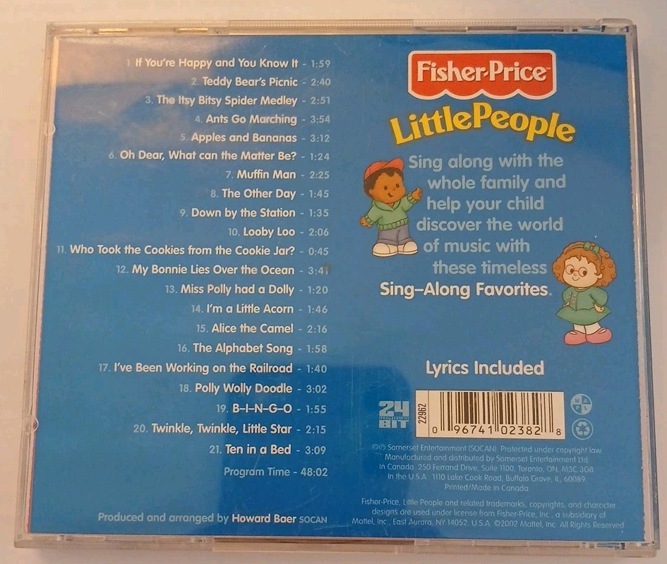 The "VINTAGE CD Little People: Sing-Along Favorites" by Fisher-Price is a classic children's music CD released in 2002. This CD features a collection of sing-along favorites specifically tailored for young listeners. With a run time of 48 minutes, it provides a fun and interactive experience for kids to enjoy singing along to popular children's songs. The Fisher-Price brand ensures high-quality entertainment and educational value for little ones.