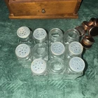 VINTAGE CRYSTAL FOODS PRODUCTS - 11 GLASS JAR WOODEN SPICE RACK Set USA MISSING ONE SPICE BOTTLE SUPPOSED TO HAVE 12 ONLY COMES WITH 11 VERY GOOD CONDITION FOR ITS AGE NOT MUCH COSMETIC DAMAGE AT ALL ONE BOTTLE SHOWN MISSING LID SHOWN IN PICS *** FREE SHIPPING ***