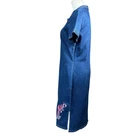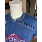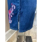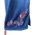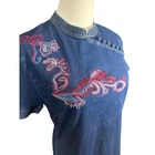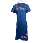 GORGEOUS LIKE BRAND NEW NO SIGNS OF WEAR VINTAGE kimono style high neckline mini dress! The reds and pinks on the embroidery are stunning, popping right off the dark denim of this dress! Zip back closure. Cotton and Spandex material give this dress some stretch. It is not marked for size so please refer to my measurements! I am guessing it is a Small!! Smoke free home! SHIPS FAST SAME OR NEXT DAY!