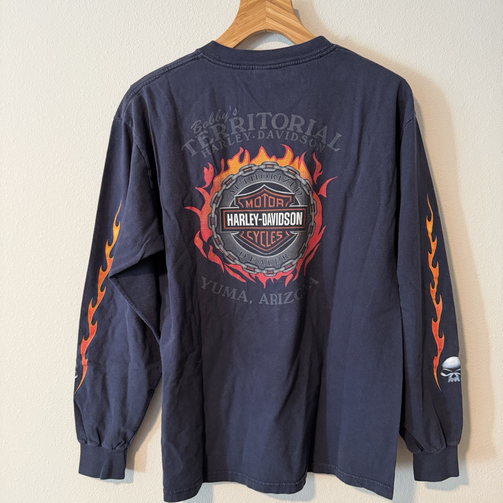 This vintage Harley Davidson long sleeve shirt in black with flames and a skull design is a stylish and iconic piece for any biker or motorcycle enthusiast. Made of cotton, this shirt features the classic Harley-Davidson logo and is machine washable for easy care. The regular fit and crew neckline make it comfortable for all-day wear, while the double-sided print adds a unique touch to the overall design. Perfect for the winter, fall, or spring seasons, this shirt is a timeless piece that embodies the American biker theme.