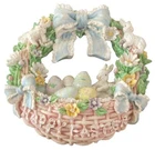 This vintage ceramic figurine from Spring brand features a hand-painted design of a colorful Easter wreath with flowers, bunnies, and eggs. Measuring 11.5 inches in length, it has a matte finish and is perfect for adding a festive touch to your Easter decor. Whether displayed on a mantel, shelf, or table, this medium-sized figurine is sure to bring joy to your home.