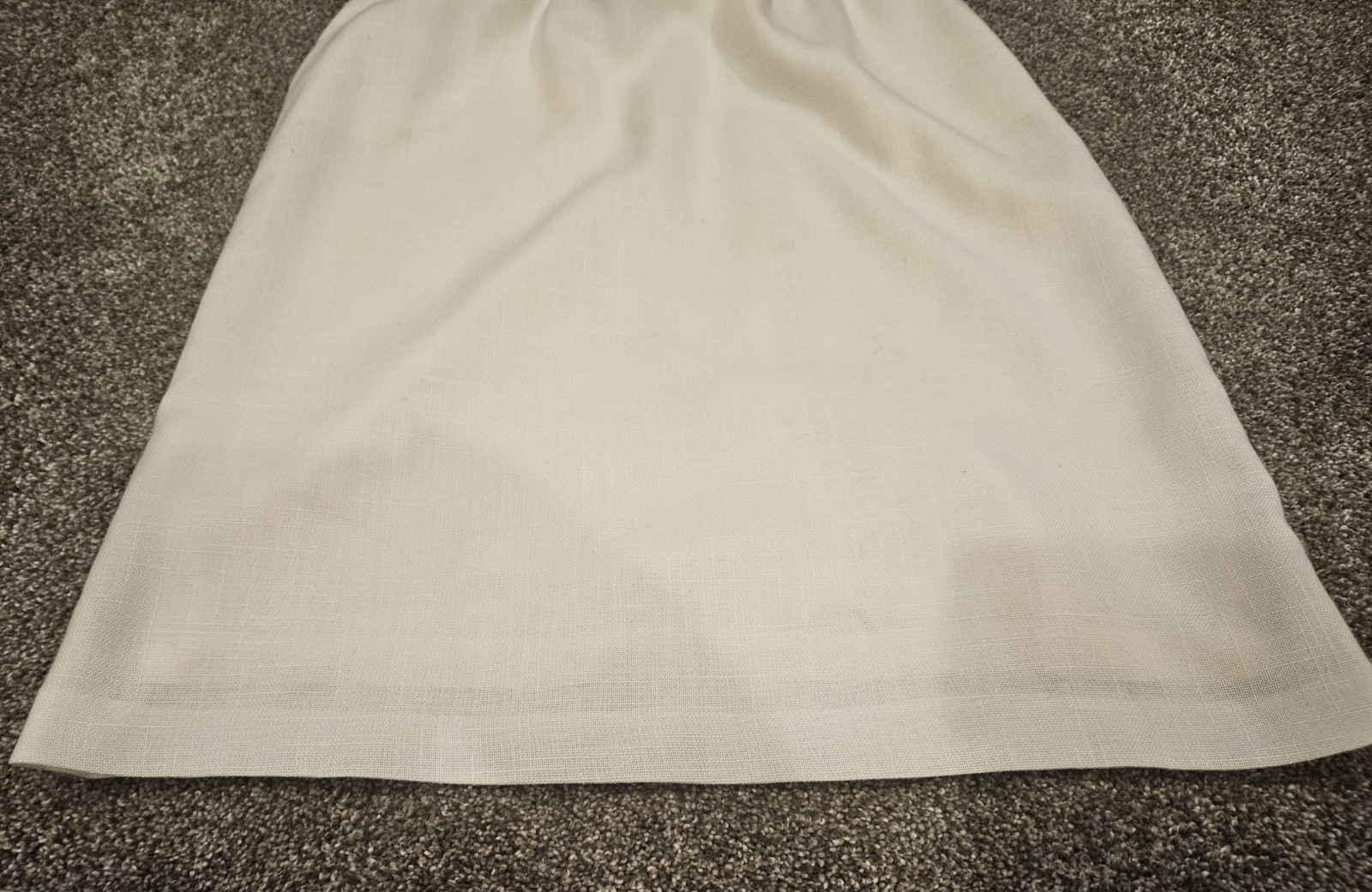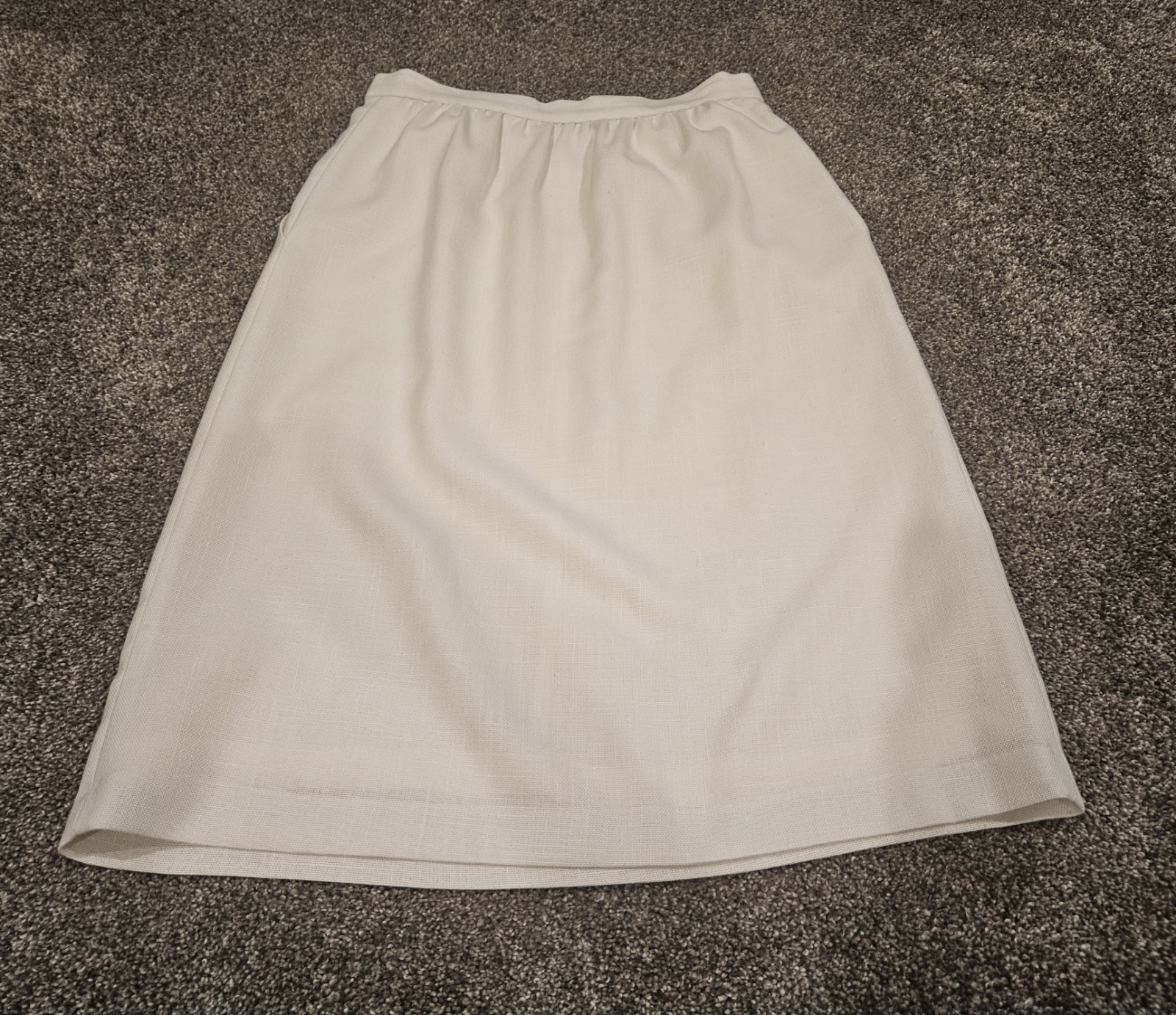 This vintage Harrington Square wool blend skirt in size 14 features a striped pattern and a midi length, making it perfect for a cottage or teacher-inspired look. The skirt is made of wool, with a straight and pencil style, and includes pockets for added functionality. The classic white color adds a timeless touch to the piece, making it a versatile addition to any woman's wardrobe.