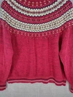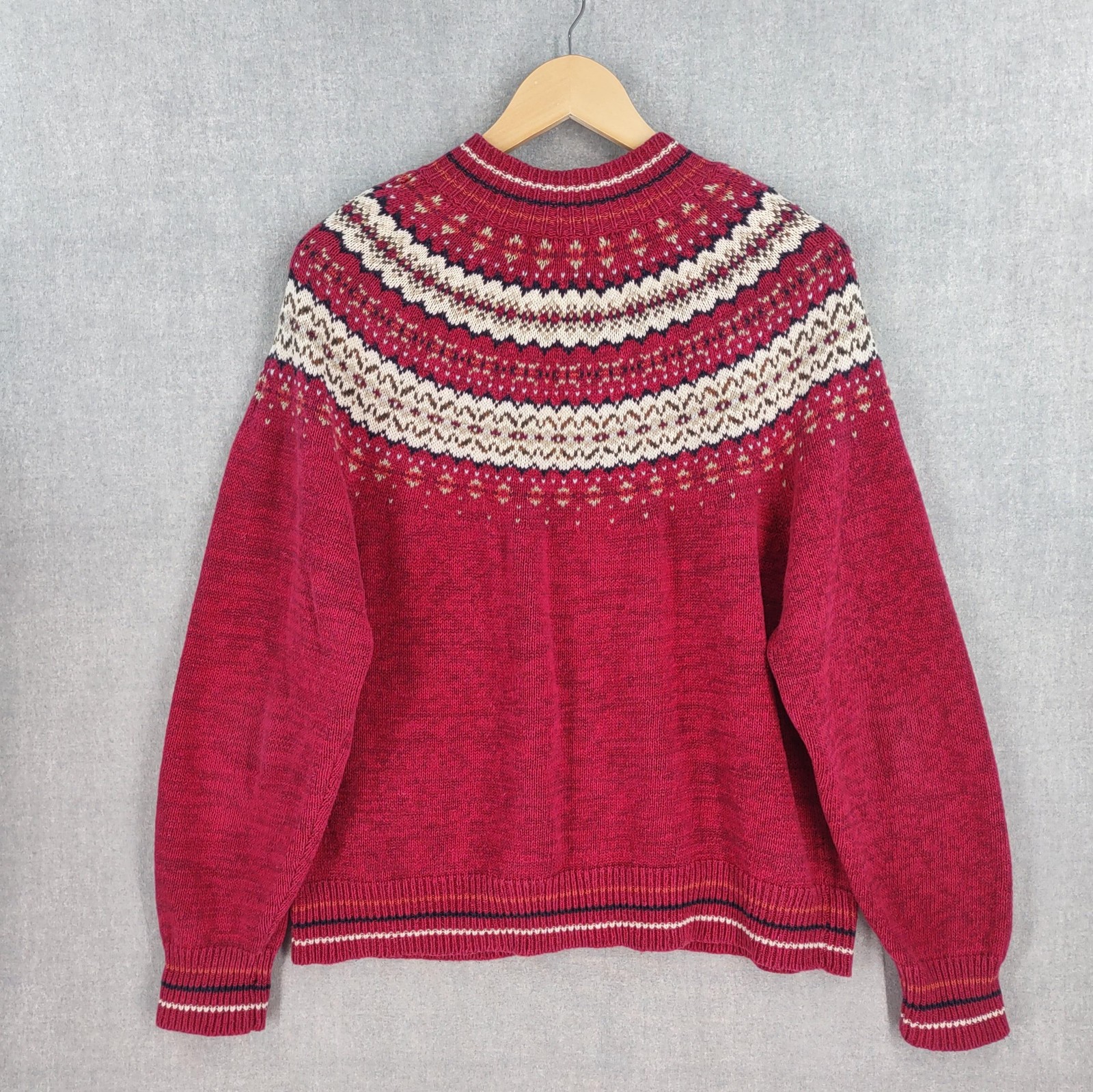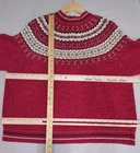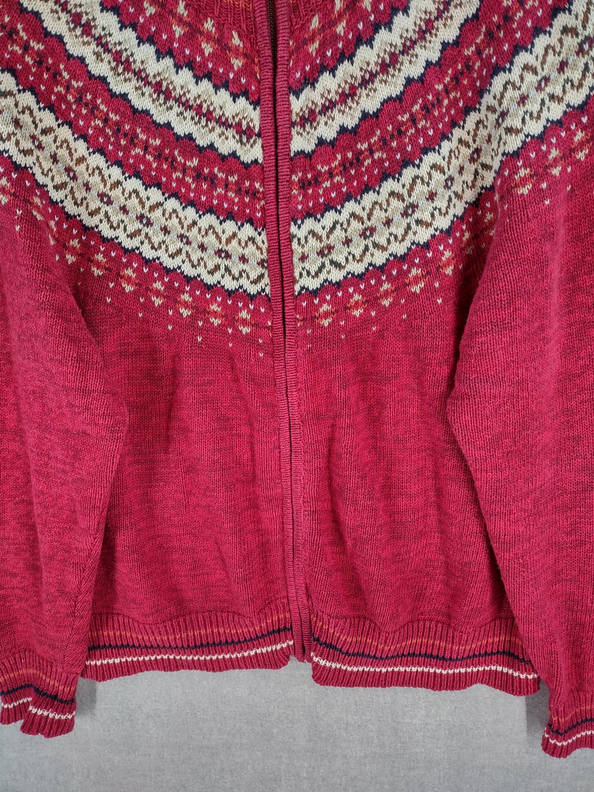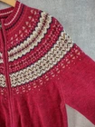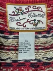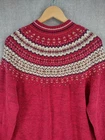 Welcome to Aspen Crossing, the place to shop for modern Western Bohemian style reflecting the rugged beauty of our American West Brand: Heirloom Collectibles Tag size: XL (Womens) - It is always best to compare the measurements above with a garment that fits you comfortably. Material: 55% Ramie, 45% Cotton RN: 83337 Made in China Design and pattern copyrighted 2001 (early 2000s production) Color: Red with cream/ivory and navy Icelandic Fair Isle yoke; striped rib trim at cuffs and hem Style: Full zip cardigan sweater with mock neck and long sleeves Features: Classic Nordic/Fair Isle patterned yoke; rib knit collar, cuffs, and hem Care per tag: Hand wash separately in cold water; do not machine wash; do not twist or wring; do not bleach; reshape; lay flat to dry Notes: Vintage item; sizing can vary—please compare to a similar sweater for best fit. Please note: While every effort has been made to reproduce actual colors in photos, variations may occur on your screen.