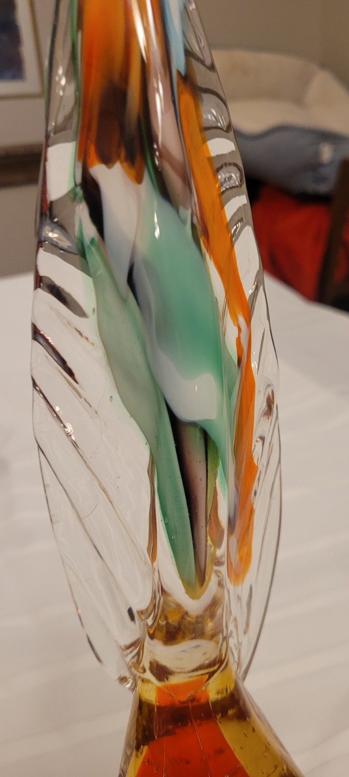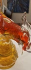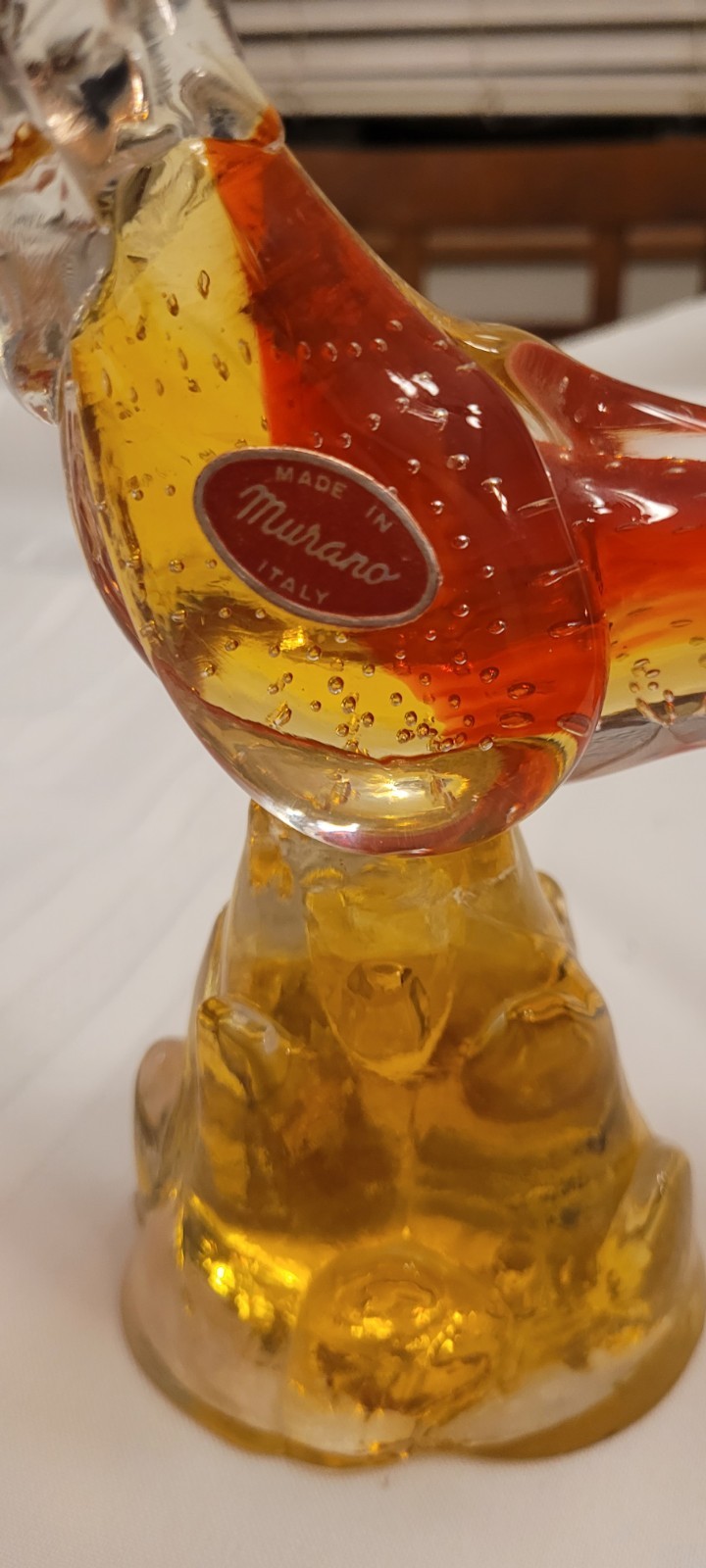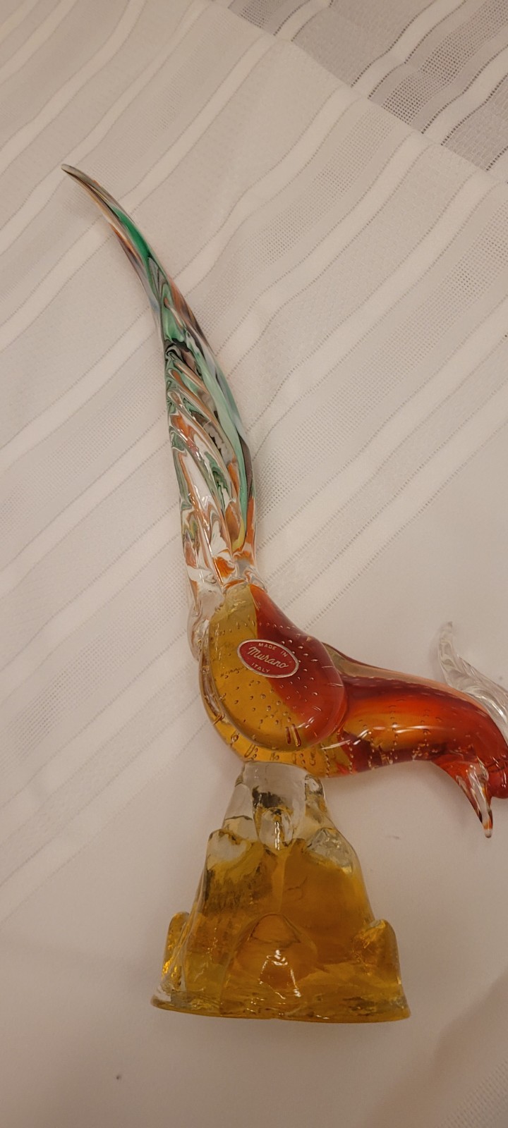 This vintage Italian Murano blown glass figurine depicts a pheasant in vibrant orange hues. Handmade in Italy during the 1950s, this unique piece showcases the artistry and craftsmanship of the Murano glassmaking tradition. The intricate hand-blown production technique adds to the beauty and charm of this bird-themed decorative piece, making it a standout addition to any collection or home decor. This unit has the UNMistakable air bubbles throughout the body of the figurine.. ALSO has the ORIGINAL sticker tag that makes this piece a TRULY Original piece.