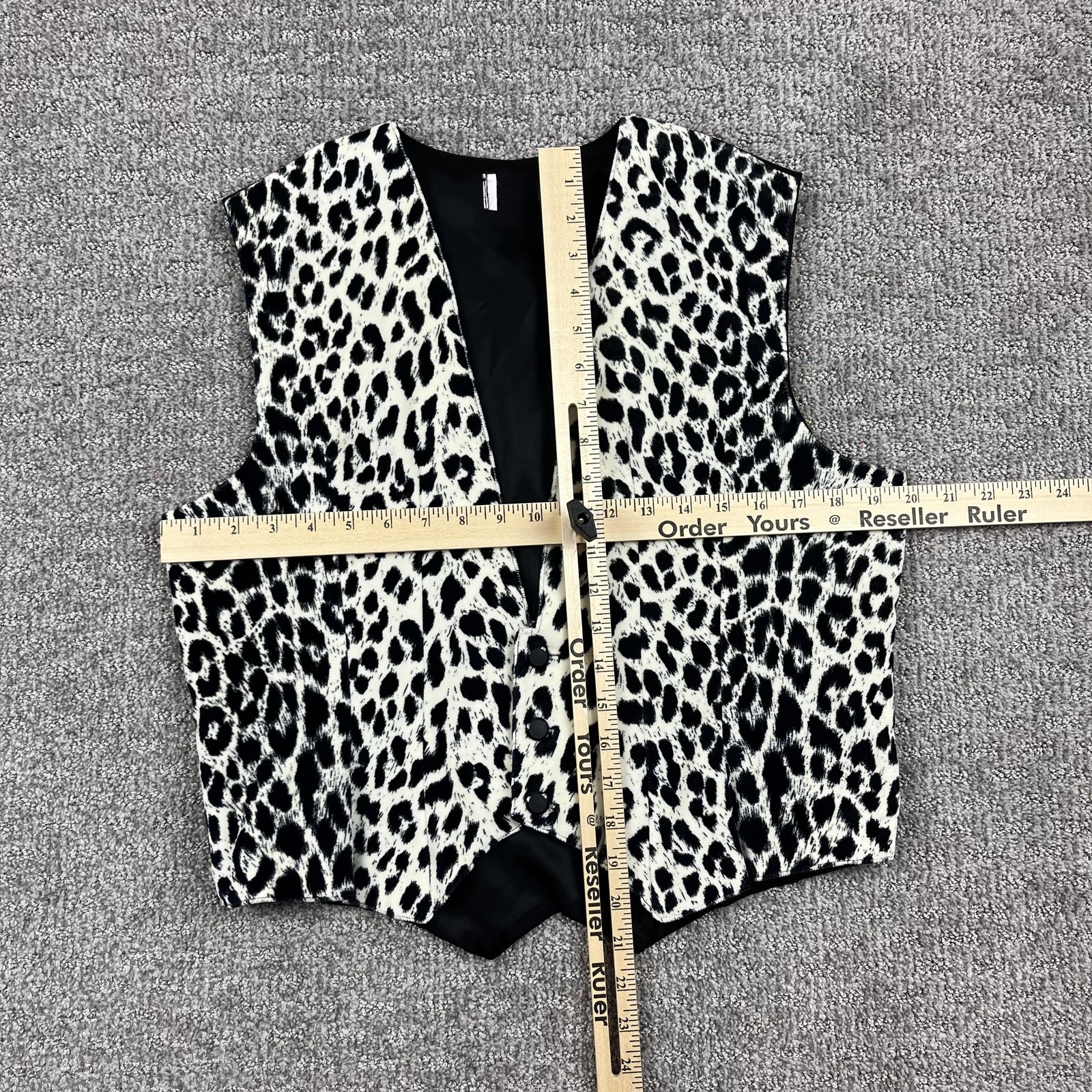 Item: Leopard print vest with classic waistcoat styling Color/Pattern: Black and white animal print (leopard) Gender/Size: Womens Medium (tag shows M) Material: Body 100% Cotton; Lining 100% Acetate Care: Professional dry clean only Country of Origin: Made in USA Identifiers: RN 35311 Design features: Deep V-neck front; pointed front hem; two front pockets; fully lined interior; satin-like back panel; adjustable back cinch strap with buckle Notes: Brand tag has been removed; size tab remains Era: Vintage 90s style